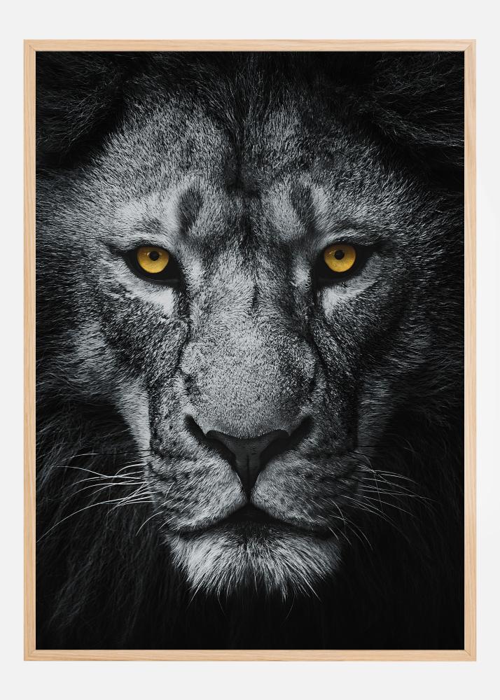 Ta drzna in sugestivna plakat prikazuje portret leva z impresivnimi detajli. Slika je v črno-beli barvi, razen levjih oči, ki žarijo v močni in živahni rumeni barvi, kar ustvarja neustavljivo osredotočenost v motivu. Premišljena uporaba barve in kontrasta daje občutek intenzivnosti in prisotnosti, ki ujame in zadrži opazovalčevo pozornost. Ta plakat je popoln za tiste, ki si želijo občutek divje in naravne moči v svoji notranjosti.