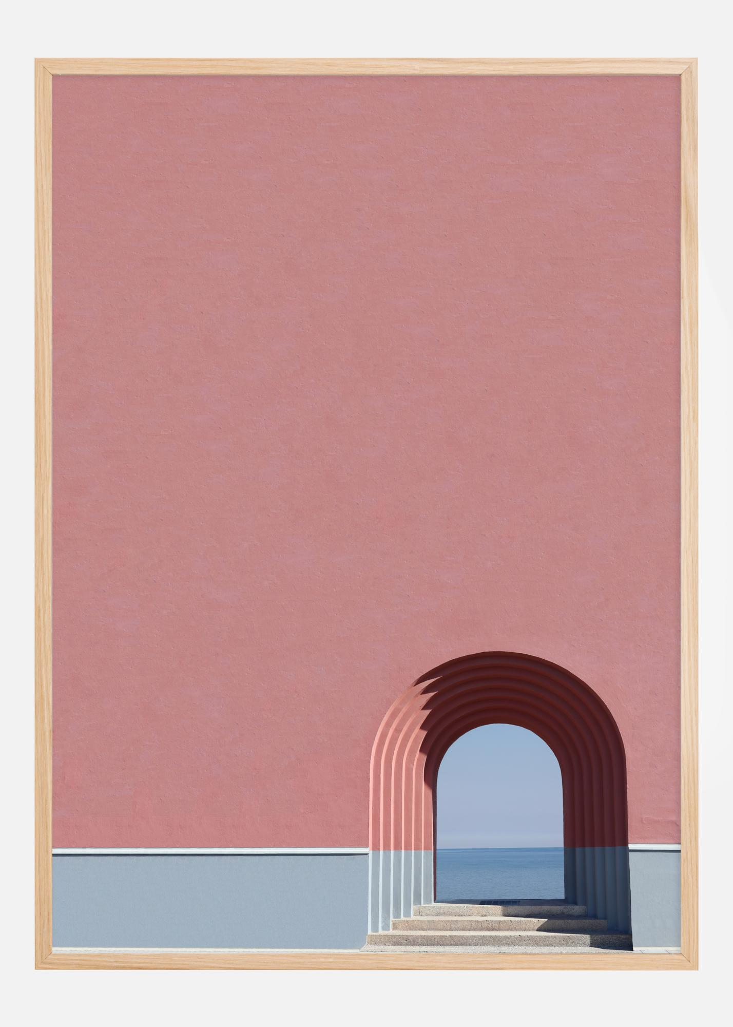 Ta plakat z naslovom "Poglej ocean" vabi k premišljevanju s svojo preprosto in čisto zasnovo. Slika poudarja miren arhitekturni lok, ki se odpira proti neskončnemu horizontu morja. Motiv igra s kontrastom med mehkim rožnatim odtenkom stene in mirnim modrim morjem, ustvarjajoč občutek miru in harmonije.