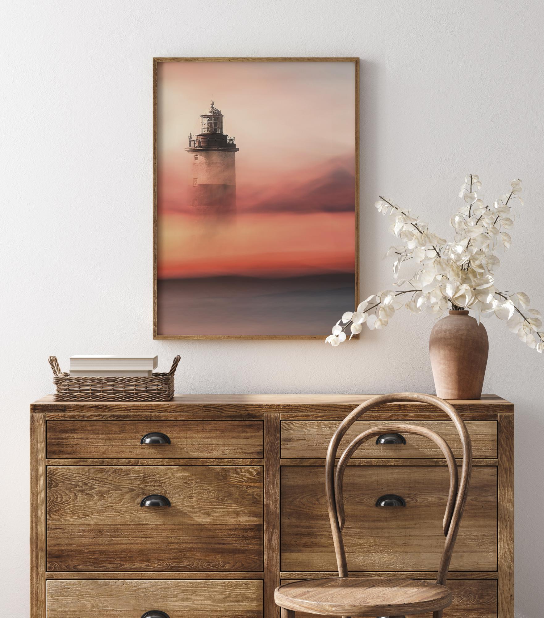 Čudovit romantičen tisk svetilnika v morskih meglicah. Mehke, roza pastelne barve ustvarjajo občutek romantike, medtem ko mehko modro obarvano morje daje temnejši ton tej čudoviti sliki. Obesite to podobo v vašem domu in občutite ter slišite morski vetrič.