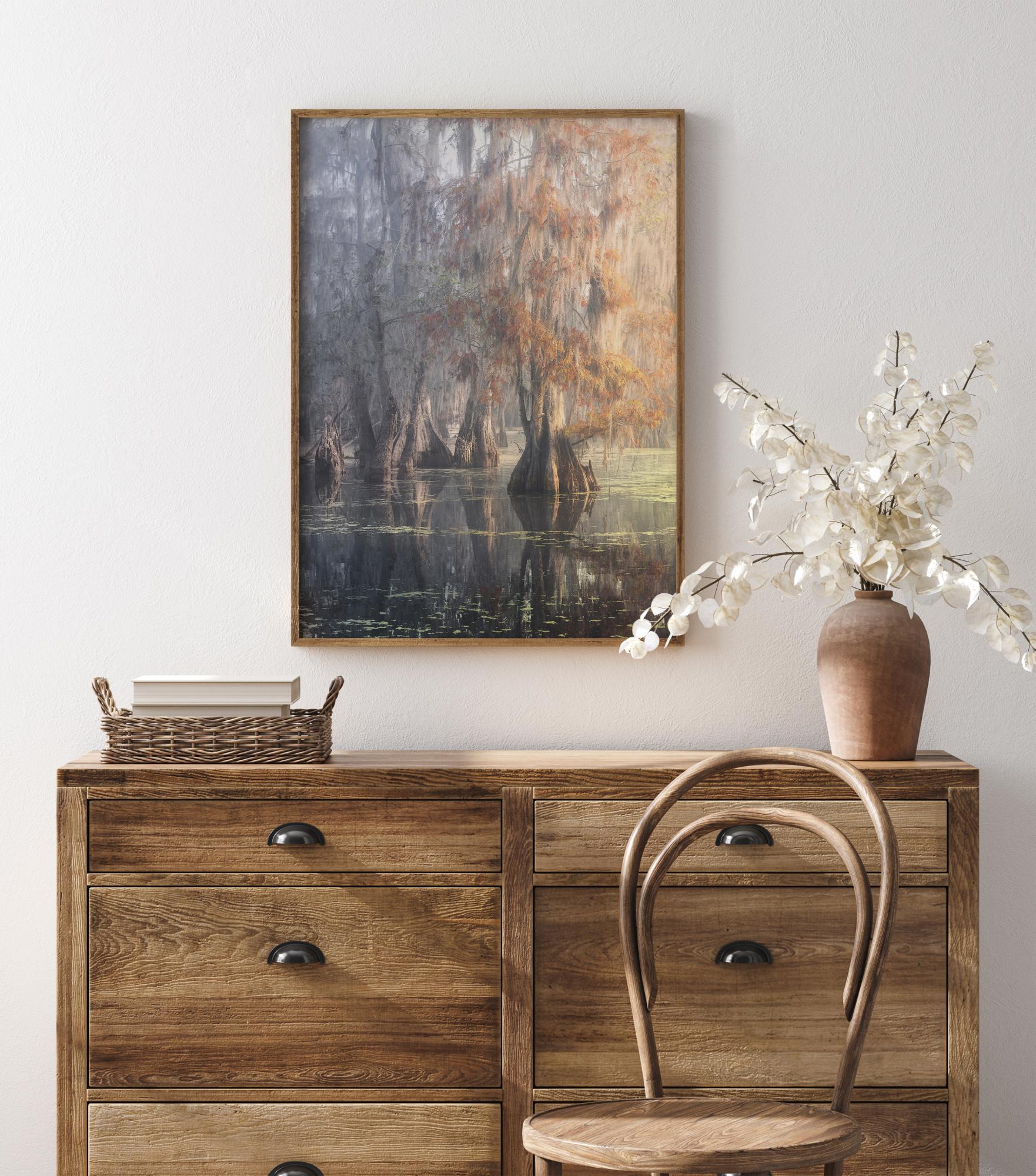 Osupljivo lep plakat s močvirjem v Louisiani. Izjemno mirna slika močvirja z mirno vodo. Naravna svetloba ustvarja popolne odseve v močvirju in ustvarja občutek miru. Prinesite naravo v svoj dom s čudovitimi zelenimi in rjavimi toni tega tiska.