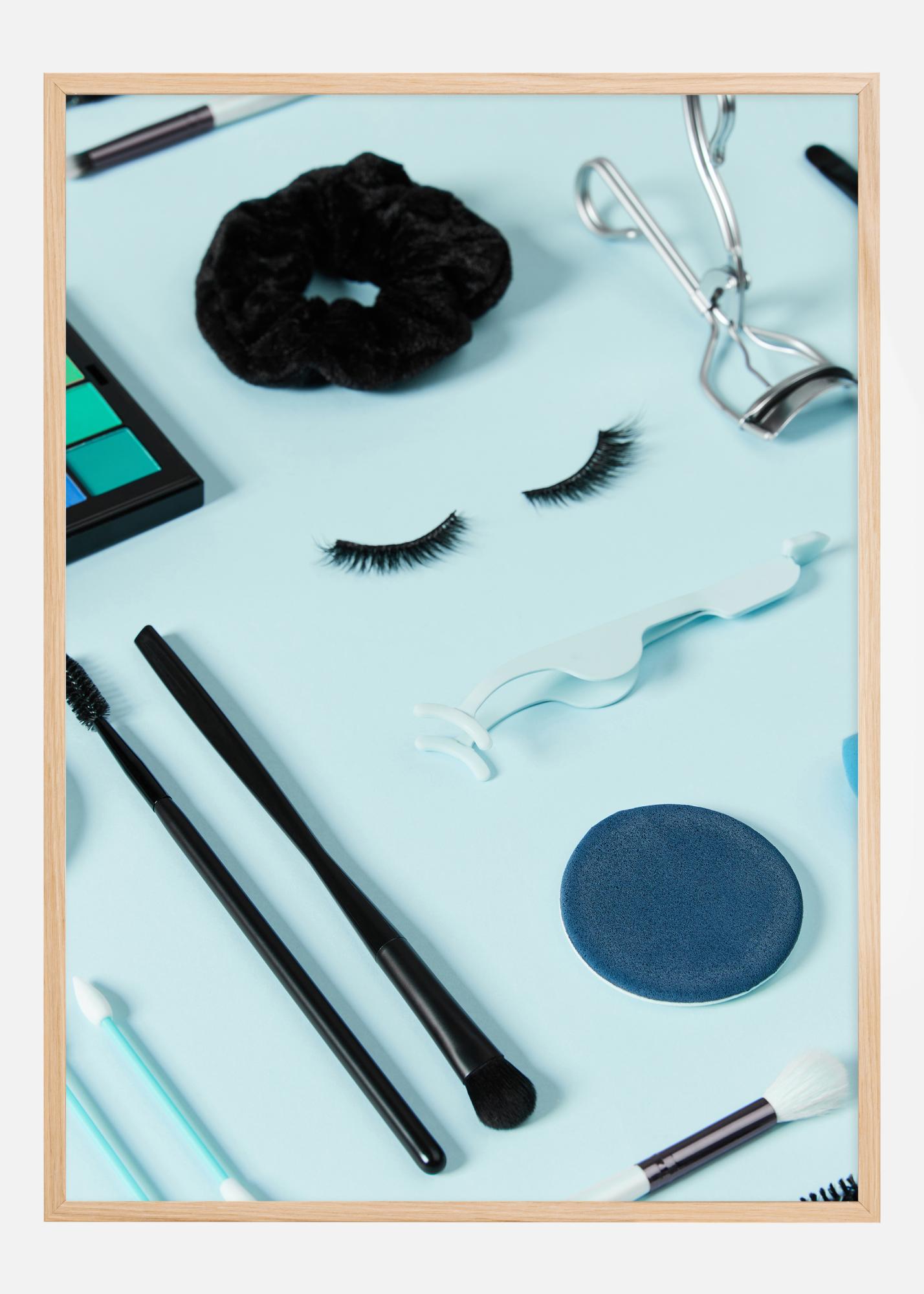 Barvna paleta je prevladujejo mehki in pomirjujoči odtenki modre, ki jih dopolnjujejo črna in srebrna, kar daje svež in sodoben videz. Realistične podrobnosti čopičev za ličenje, vihalnika trepalnic in umetnih trepalnic lepo nasprotujejo minimalistični podlagi, in struktura črne elastike za lase zagotavlja zanimiv vizualni element. Ta odtis bo odličen dodatek kopalnici, toaletni mizi ali kjerkoli, kjer sta lepota in slog najpomembnejša. Je popoln za navdih in popestritev vaše vsakodnevne lepotne rutine.