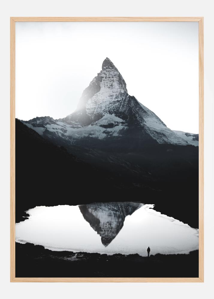 Ta čudoviti črno-beli plakat prikazuje vrh Matterhorna, ki predira jutranje nebo. Sončni žarki prekrivajo razgibano pobočje gore, medtem ko moški opazuje vrh. Odsev je ujet v jezeru na dnu prizora. Slišite tišino, ko obesite ta tisk v svojo dnevno sobo.