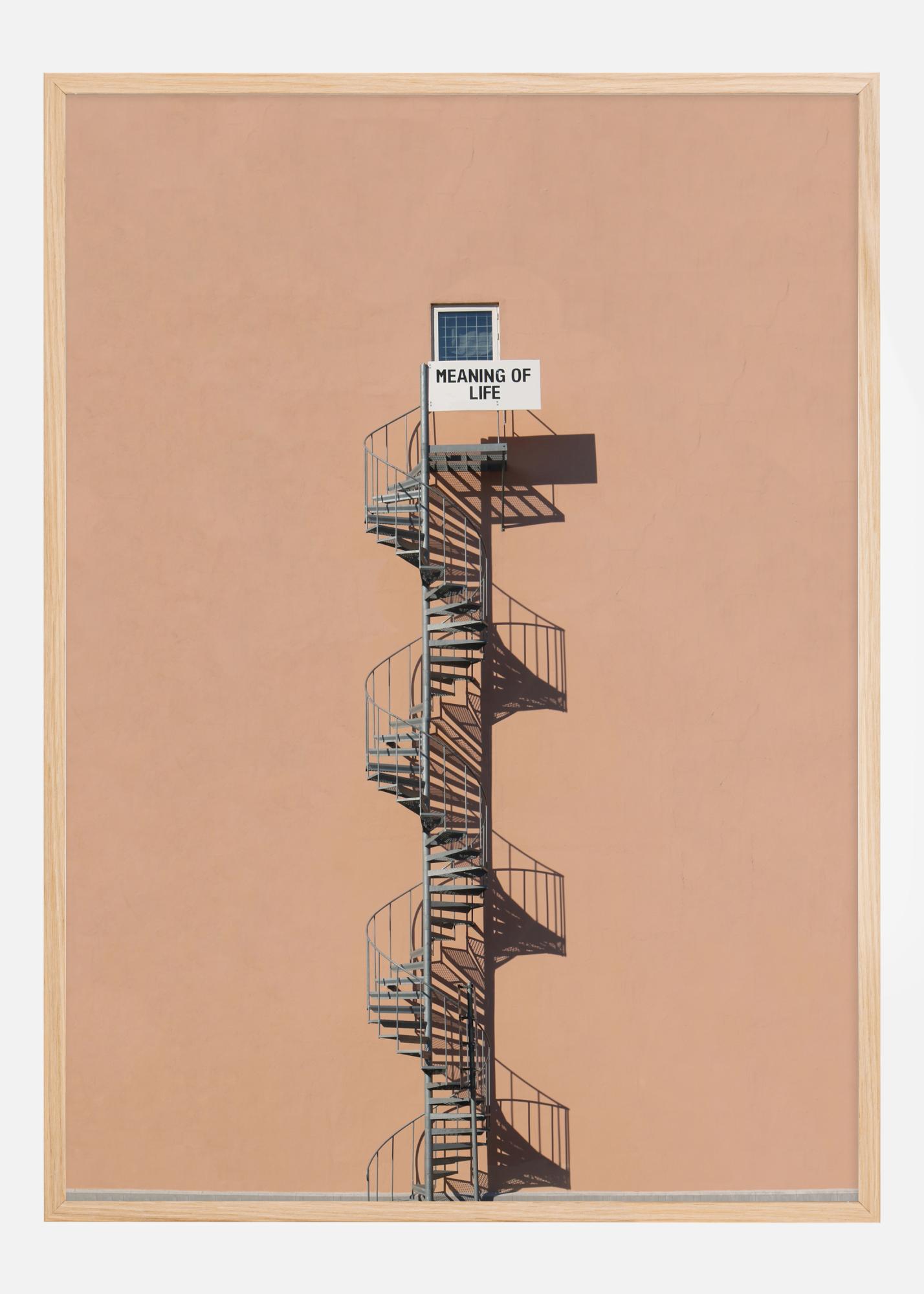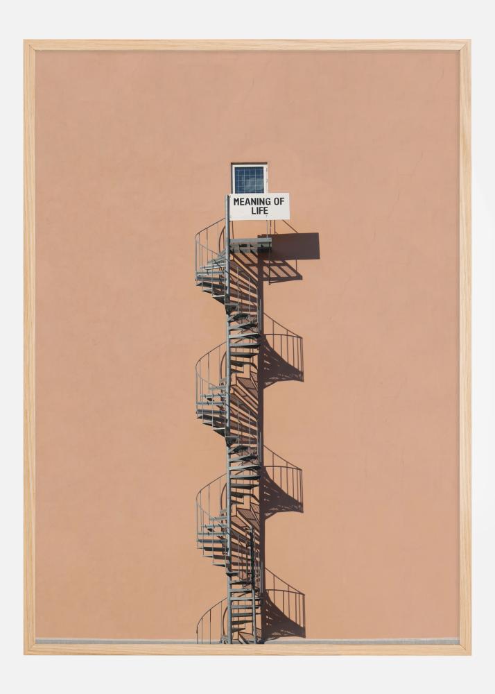 V minimalističnem, enotno obarvanem ozadju izstopa stopnišče kot struktura, ki je tako fizična kot simbolična, pri čemer lahko vsak korak predstavlja izkušnjo, učenje ali obdobje v življenju. Namestitev znaka na vrhu namiguje, da je pomen življenja nekaj, za kar si nenehno prizadevamo, vendar morda nikoli v celoti ne moremo dojeti ali popolnoma razumeti.