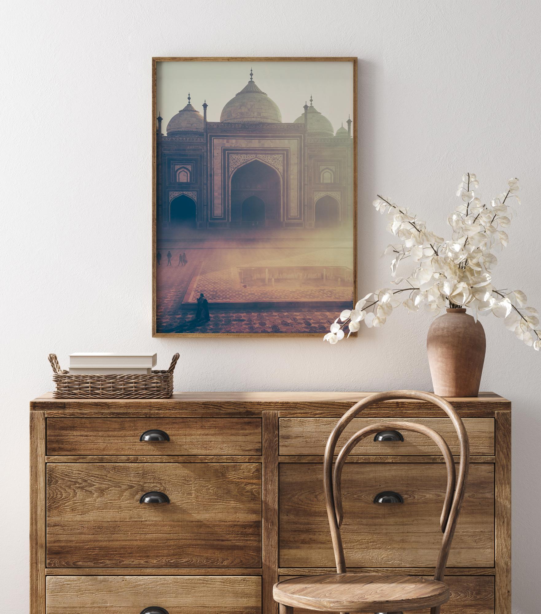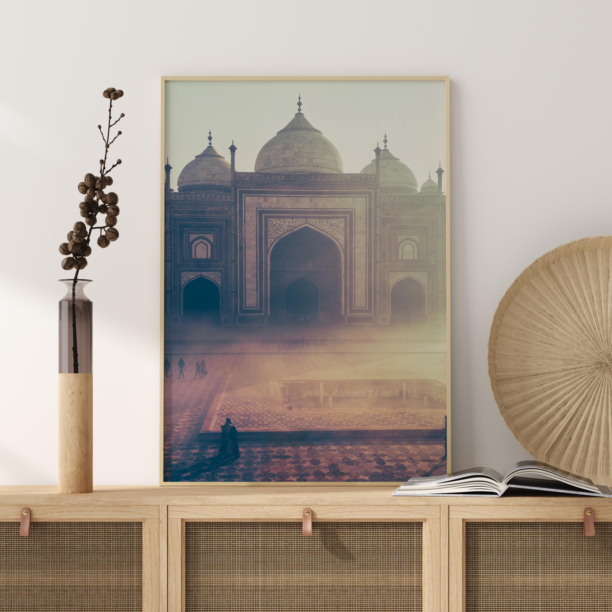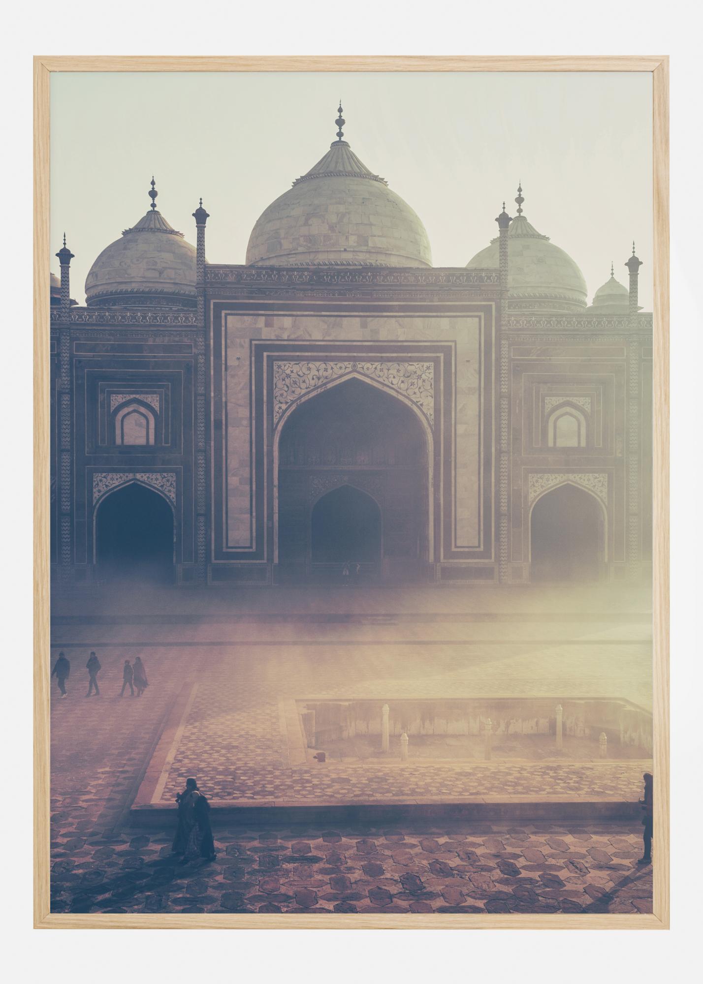 Duhovno središče muslimanskega sveta samozavestno stoji na trgu v ospredju. Majhna skupina ljudi se sprehaja po trgu skozi močno osvetljeno, trajajočo meglo. Največji vhod v mošejo je ob straneh obdan z manjšimi vhodi tako na levi kot na desni. Miren plakat za ustvarjanje pomirjujočega vzdušja.
