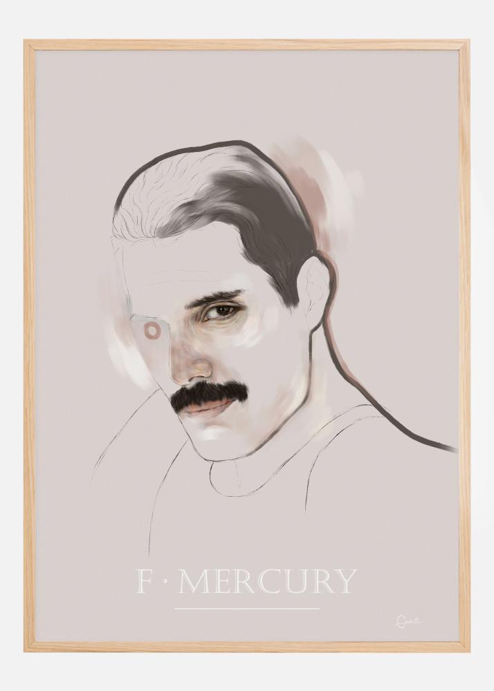 Impresiven portret Freddieja Mercuryja na svetlo roza ozadju. Njegovo levo oko ujame vaš pogled, medtem ko je njegovo desno oko zamenjano z obročem. Njegovi drzni črni brki in črni lasje so glavne značilnosti tega osupljivega posterja. Močne črte rišejo obrise njegove glave in ramen. Slišite glasbo, ko obesite ta portret v svoj dom.
