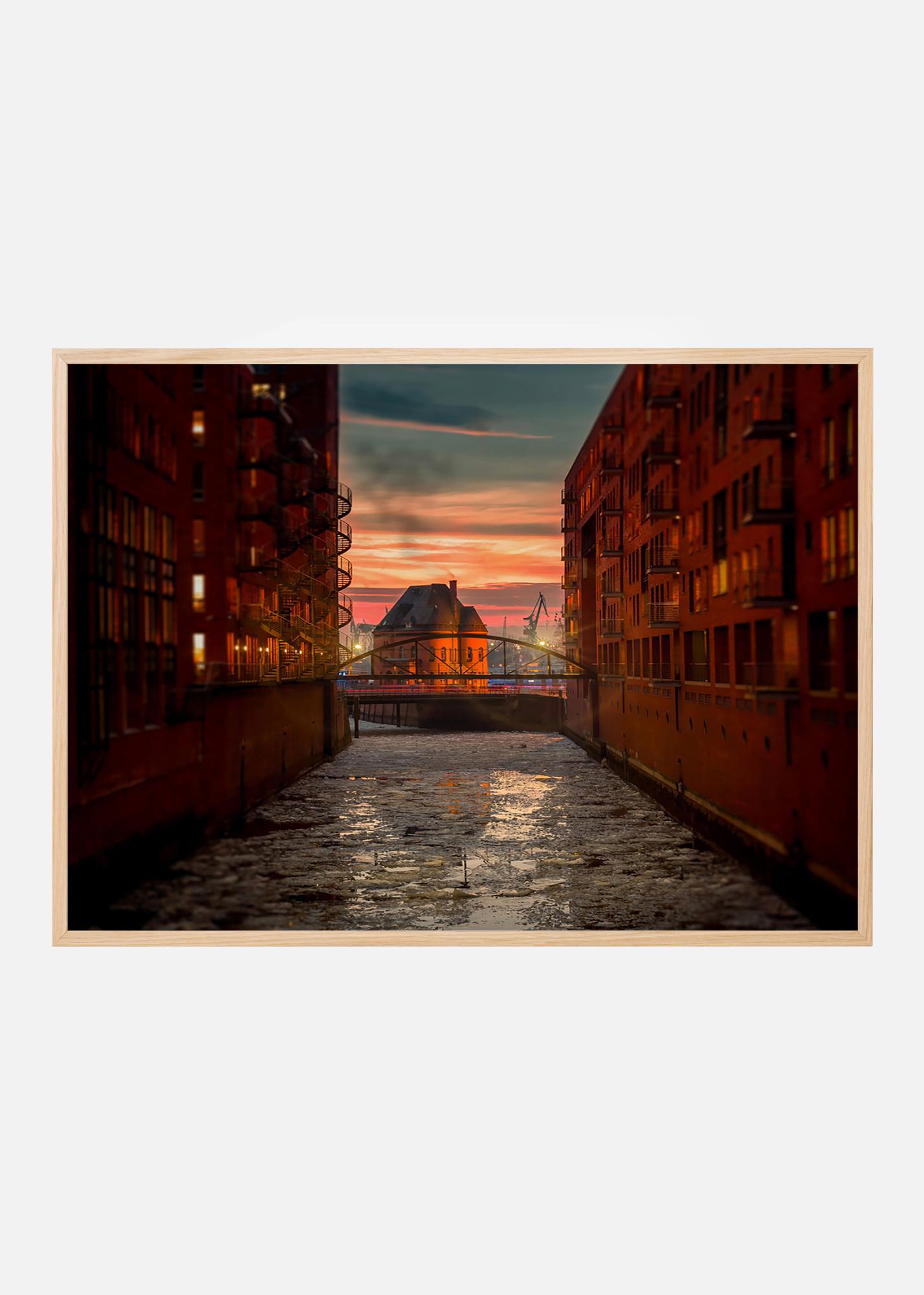 Sončni zahod nad starim skladiščnim okrožjem Speicherstadt v Hamburgu s svojimi kanali in novogotskimi opečnatimi stavbami. Fotografija iz tega zaščitenega območja lepo dopolnjuje dom arhitekturno ali zgodovinsko navdušenih posameznikov. Plakat najbolje pride do izraza v tankem kovinskem okviru, ki se ujema s strogo arhitekturo in bo lepo videti na steni skupaj z drugimi mestnimi podobami.