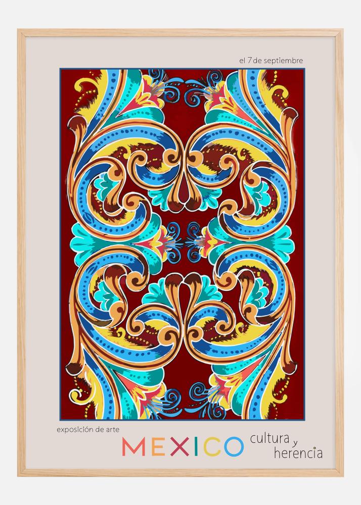 Ta živahen in barvit plakat praznuje umetniško razstavo v Mehiki. Njegova zasnova je navdihnjena s tradicionalnimi mehiškimi vzorci, polnimi vijugastih krivulj in razkošnih cvetličnih motivov, ki vabijo oko, da pleše po podobi. Bogate rdeče, rumene in modre barve so značilne za mehiško ljudsko umetnost in simbolizirajo kulturo in dediščino naroda z modernim pridihom.