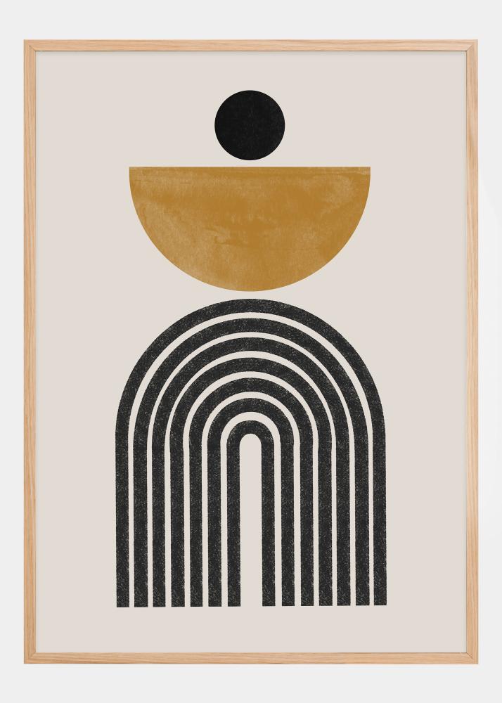 Poglobite se v svet abstrakcije in simetrije z našim modernim plakatom, ki prikazuje serijo črno-belih lokov pod sončno oblikovano zlato polkroglo, ki jo krasi črn krog. Ta tisk je oda jasnosti moderne umetnosti in enostavnosti geometričnega oblikovanja, kar prinaša prefinjen pridih vaši notranjosti. Barve so drzno zmanjšane, da poudarijo kontrast in vizualno težo vsake oblike.