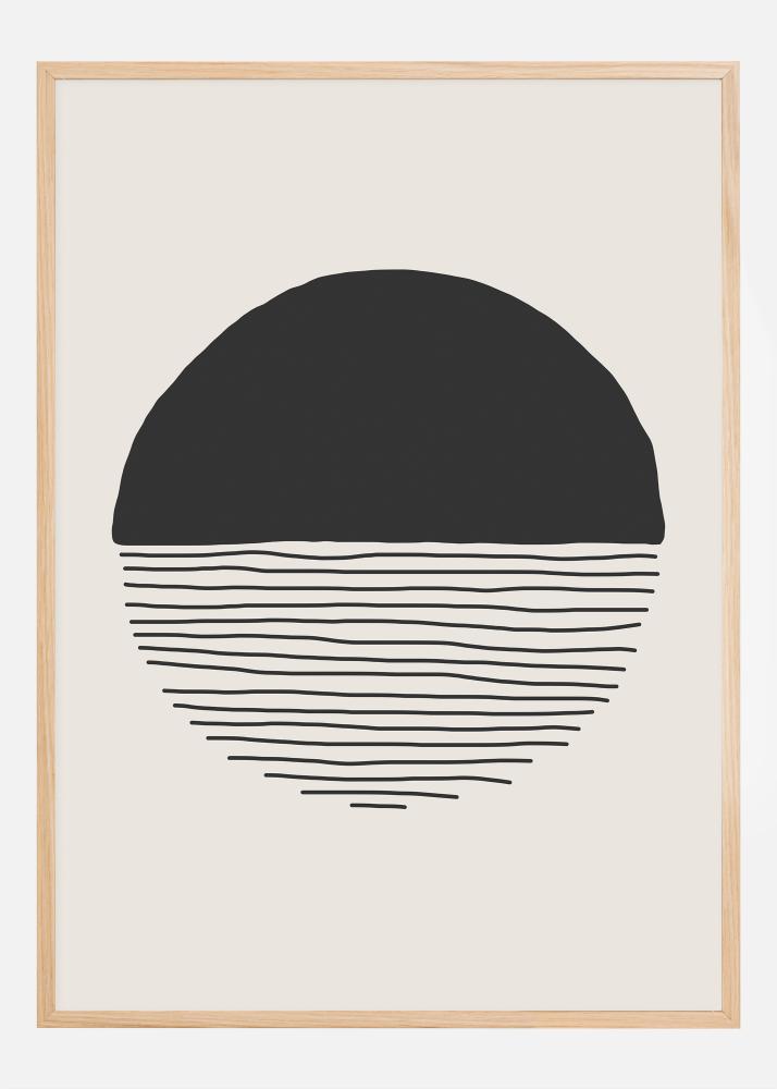 Ta plakat je poklon čistosti in moči minimalističnega oblikovanja. V motivu vidimo polkrog v globoki črni barvi, ki lebdi nad serijo vodoravnih črt v isti temni barvi. Ta preprost, a drzen kontrast na kremastem ozadju ustvarja močan vizualni učinek. Popoln je za ustvarjanje modernega in sofisticiranega vtisa v prostoru, ki ceni strogo oblikovanje in močne, grafične elemente.