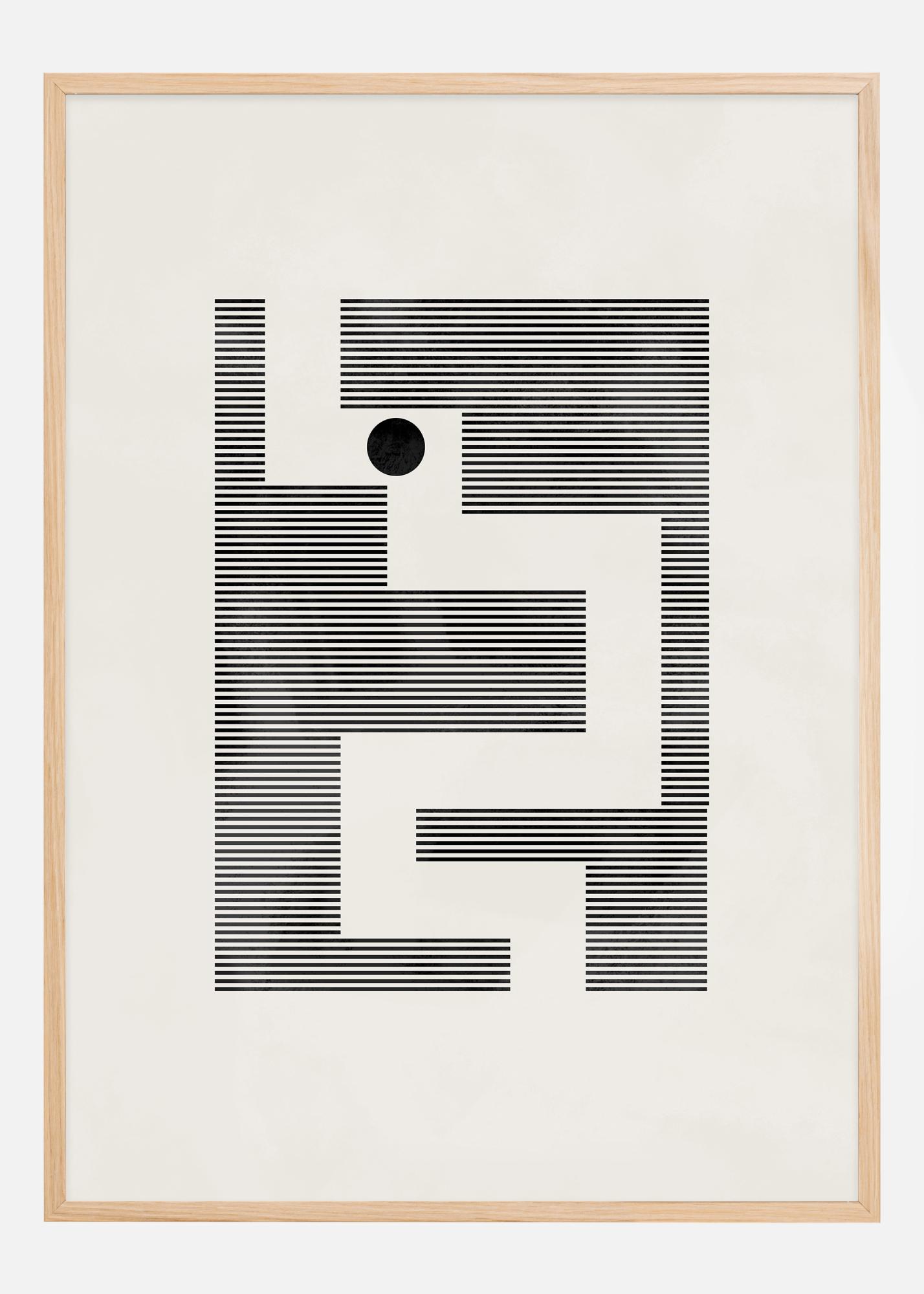 Ta umetniški plakat ponuja minimalistično interpretacijo labirinta, izvedenega s črnimi linijami, ki tvorijo zapleteno tkanje geometrijskih oblik na kremni podlagi. Osamljeni črni krog, postavljen v središče labirinta, deluje kot vizualno sidrišče, hkrati pa daje globino in osredotočenost sicer preprostem motivu. Ta dizajn se igra z očesom opazovalca in spodbuja k vizualnemu raziskovanju njegovih poti in slepih ulic.