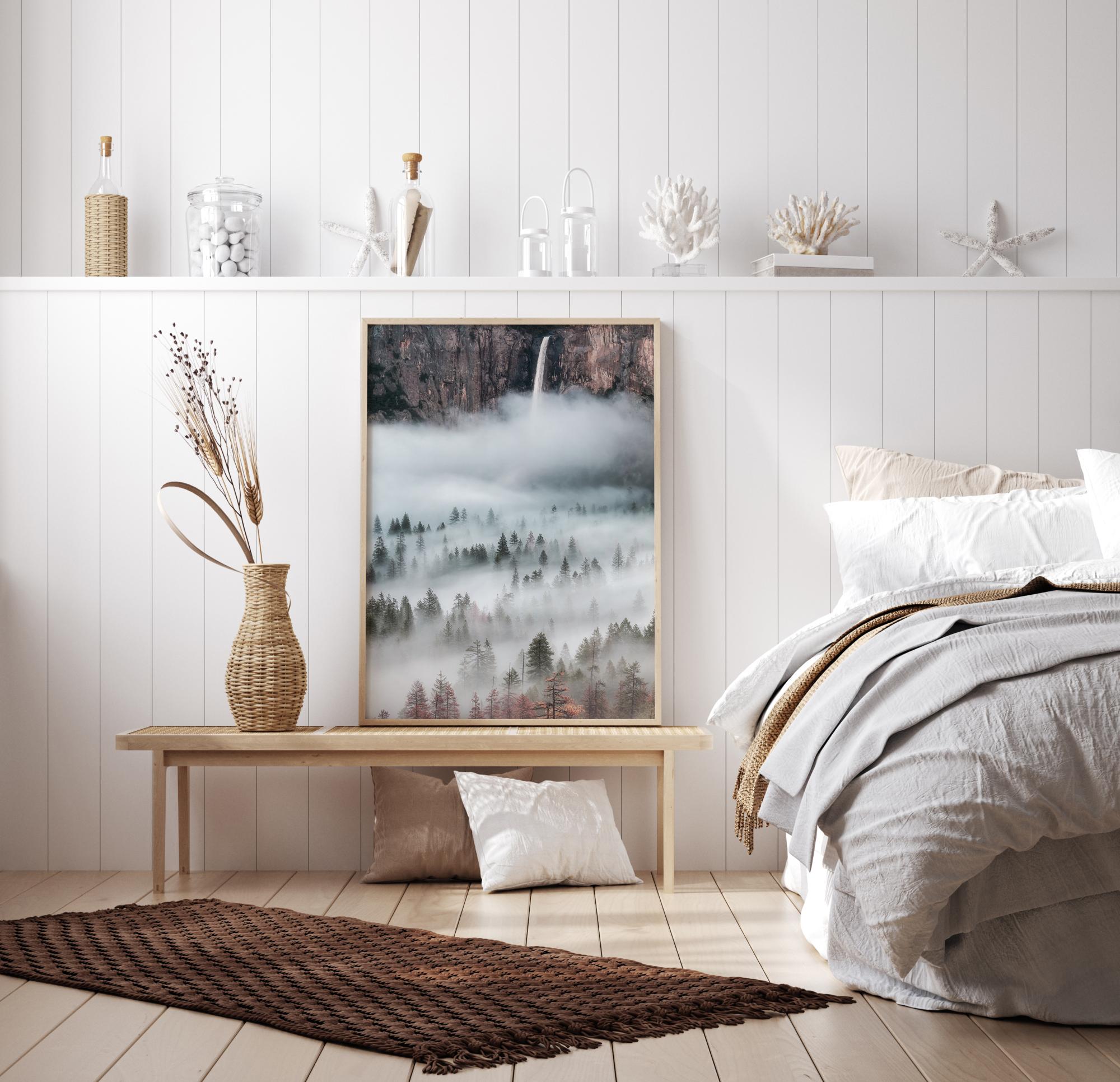 Cudovita fotografija meglenega pobočja z nekaj kamni in spektakularnim slapom v ozadju. Oblačna megla mirno lebdi in daje občutek hladnega jutra, ki polepša vaš dom. Čudovite jesenske barve in lebdeča megla dajejo občutek skrivnosti.