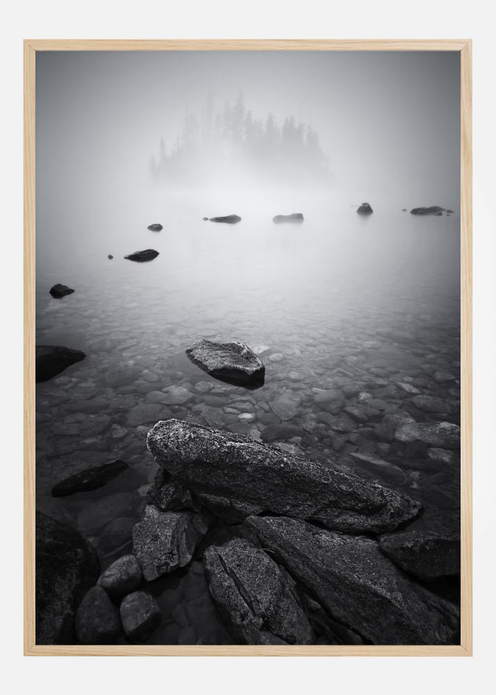 Skrivnosten plakat z naravno temo, ki prikazuje kamne in megleno jezero. Predstavljajte si, kaj se skriva tam zunaj, ko gledate megleni otok, pokrit z drevesi. Naredite vaš dom čaroben s tem fantastičnim tiskom na modri steni.