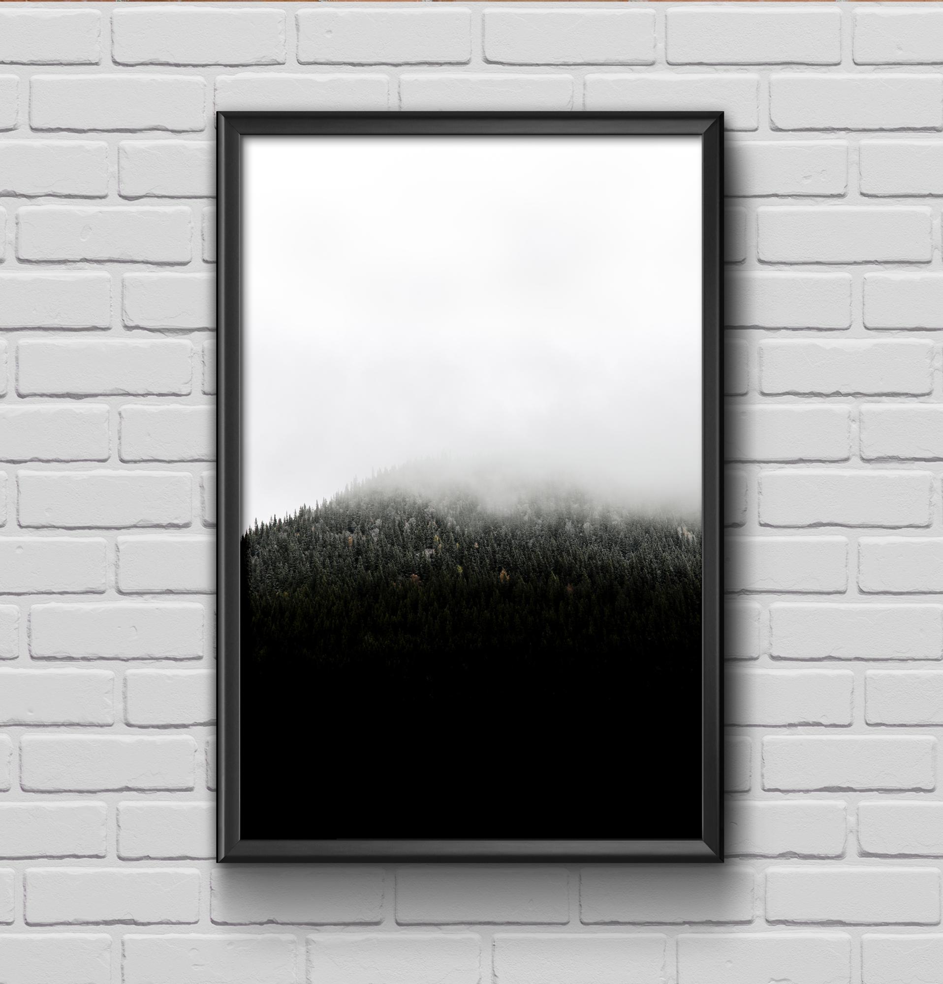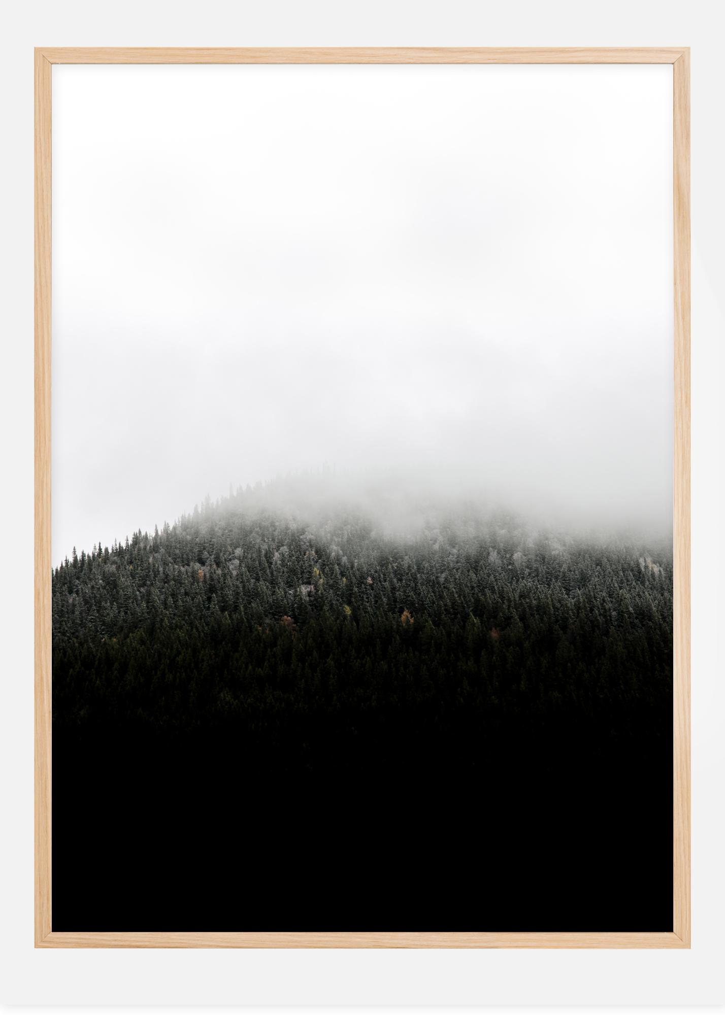 Mirna fotografija narave s gozdnatim vrhom gore, ki počiva pod gosto meglo. Miren in harmoničen poster z ostrimi kontrasti in mehkimi linijami. Kombinirajte ga z več našimi fantastičnimi motivi na večji stenski sliki.