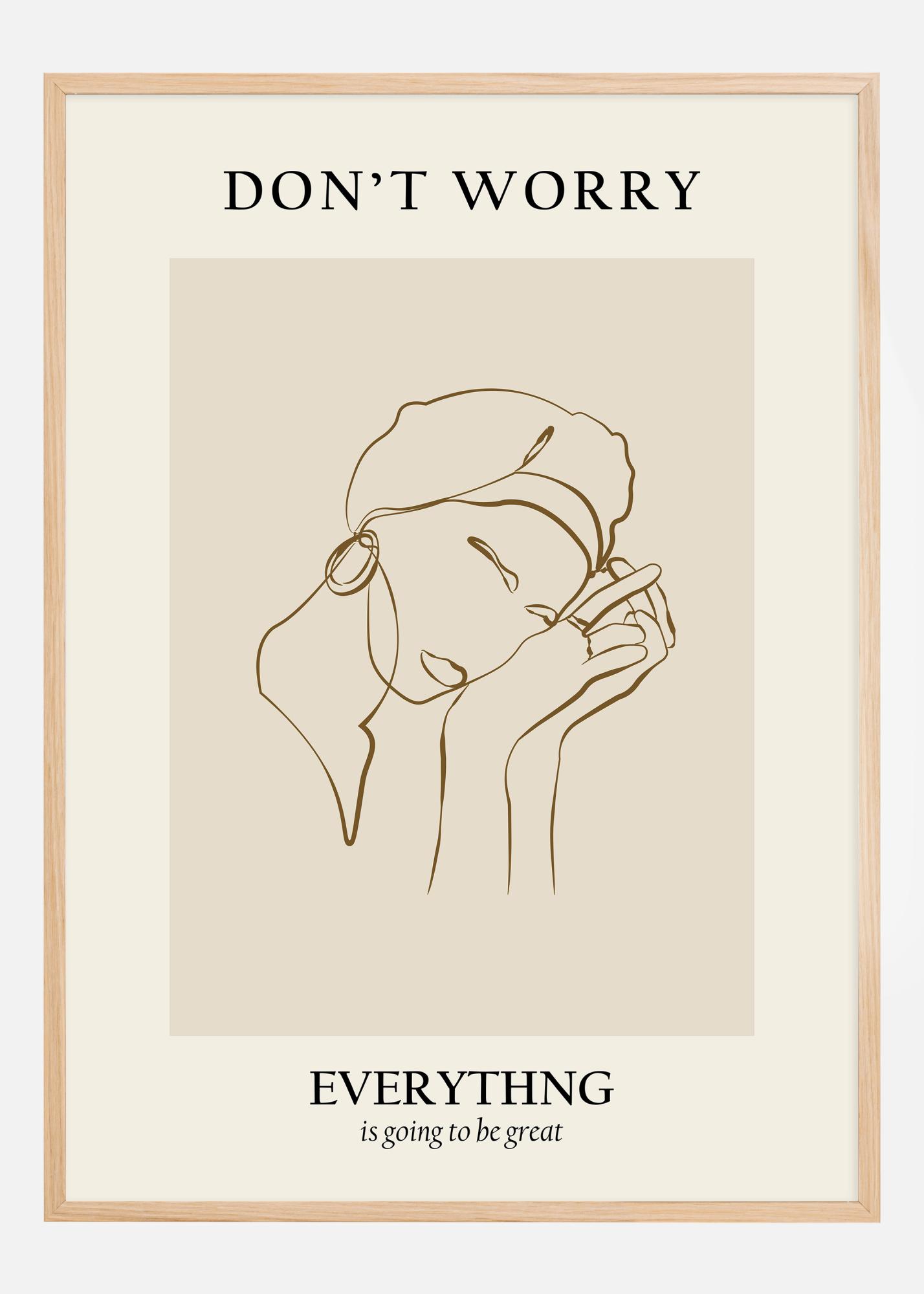 Ta umetniški poster ujame miren trenutek refleksije in notranjega miru skozi linijsko risbo osebe, ki drži roko ob obrazu. Besedilo "DON'T WORRY" v velikih črkah presega sliko in zagotavlja pomirjujoč opomnik, medtem ko "EVERYTHING is going to be great" poudarja sporočilo z bolj premišljenim tonom. To sodobno umetniško delo je popolno za ustvarjanje občutka miru in optimizma v domu ali pisarni.