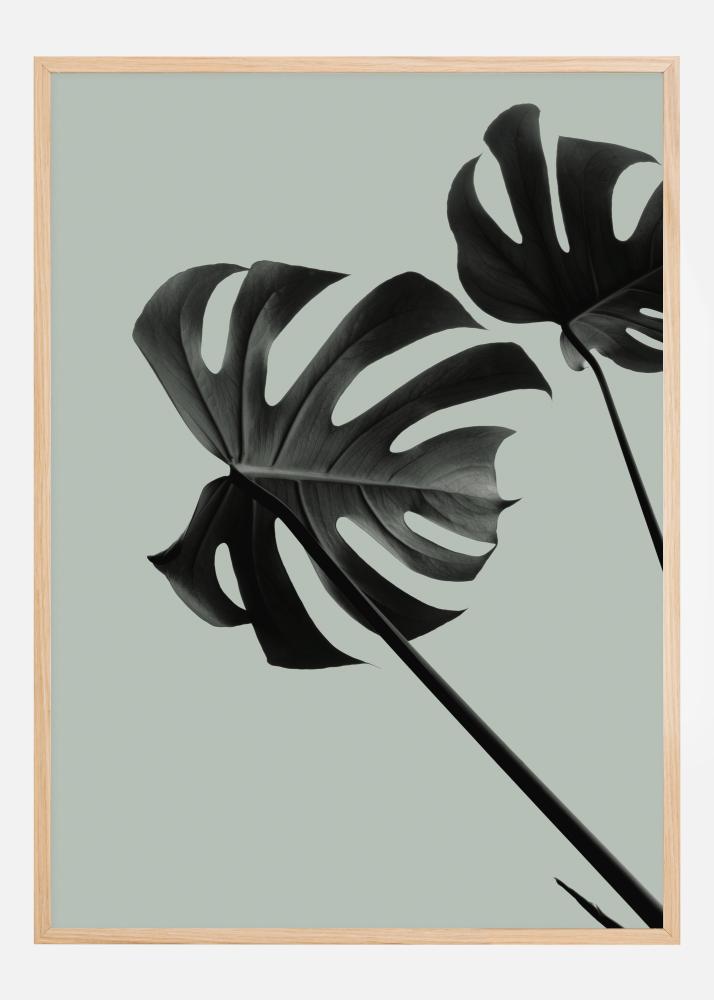 Črno-bela bližinska fotografija dveh listov monstere. Srčasti listi so vidni na mat sivi podlagi, trenutek pa je poudarjen z lučjo za perjem podobnimi vzorci. Ta plakat je popoln za vnos razburljivega občutka teh srčku podobnih listov v vaš dom.