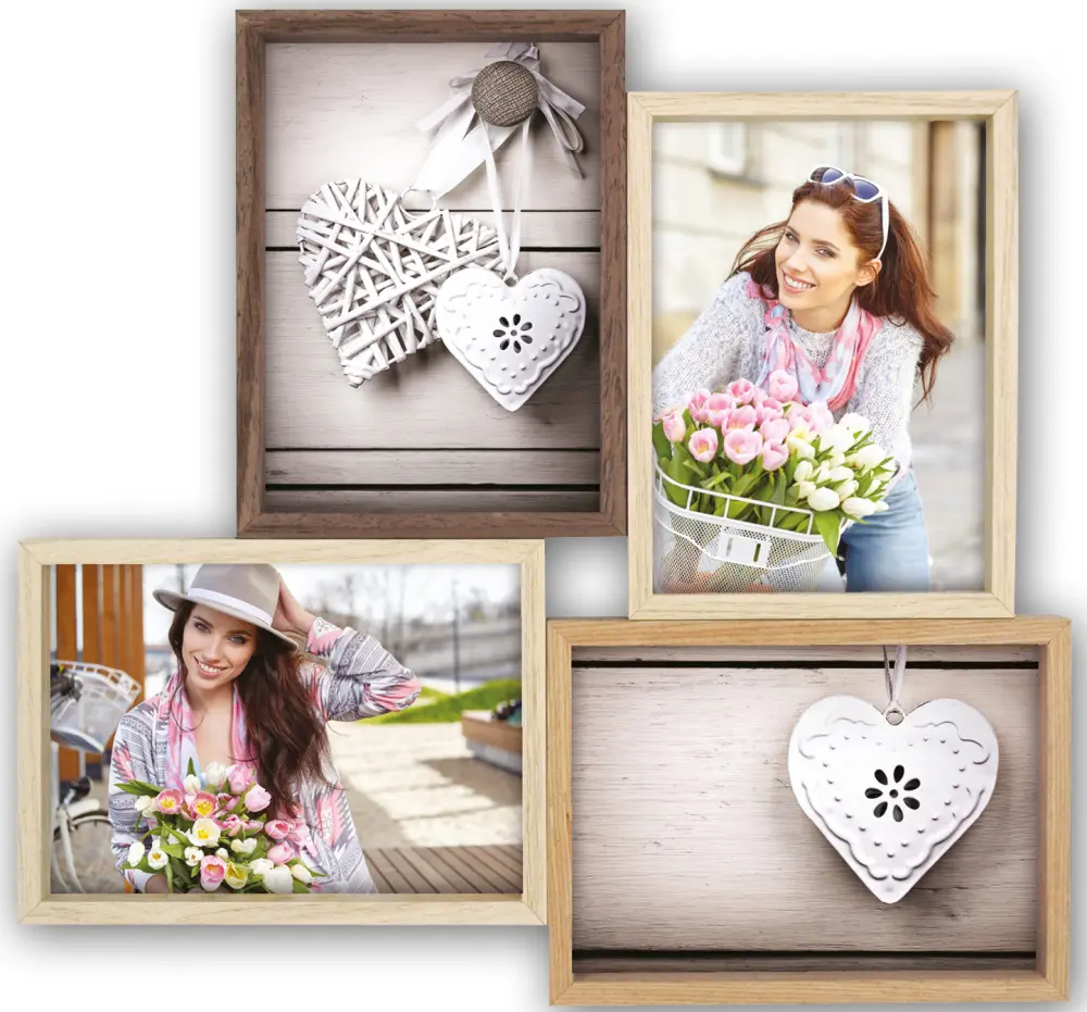Lepa okvir za kolaž iz lesa s štirimi okvirji v različnih odtenkih. Ta okvir ima prostor za 4 slike v velikosti 13x18 cm. Ta okvir ima zelo eleganten videz, kar pomeni, da se prilega v številne domove in ga je enostavno uskladiti z drugimi slikami in stenskimi dekoracijami na vaši steni. Zunanje mere okvira so 39,5x37,5 cm. Na voljo je stenski nosilec.