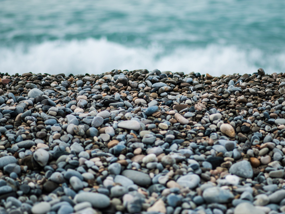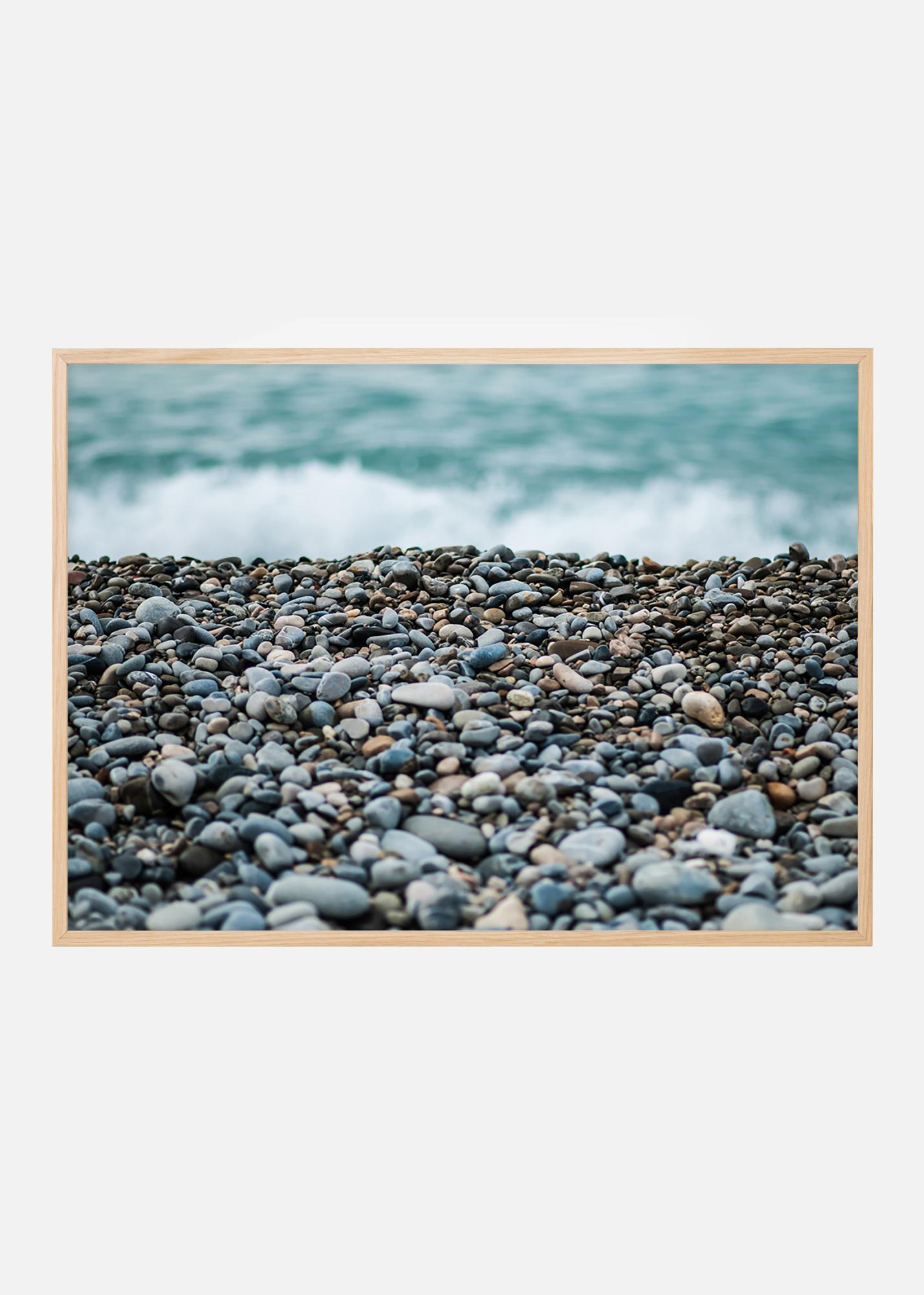 Poslušajte šumenje morskih valov na tem plakatu z lepo kamnito plažo v ospredju. Kratka globinska ostrina ustvarja zanimivo sliko, ki pritegne oči v sliko. Ali najdete kakšen zaobljen kos stekla med kamni? Sivo-modra barvna paleta se lepo ujema z ozkim okvirjem na svetli steni, po možnosti z morskimi dodatki.