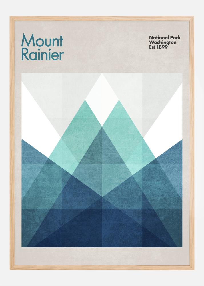 Ta grafično elegantna plakatica slavi Nacionalni park Mount Rainier v Washingtonu, ustanovljen leta 1899. Z vrsto prekrivajočih se trikotnikov, ki ustvarjajo abstraktno podobo gore, oblikovanje uporablja sence modre in turkizne barve za prenašanje raznolikega terena in dramatične pokrajine, po kateri je park znan.