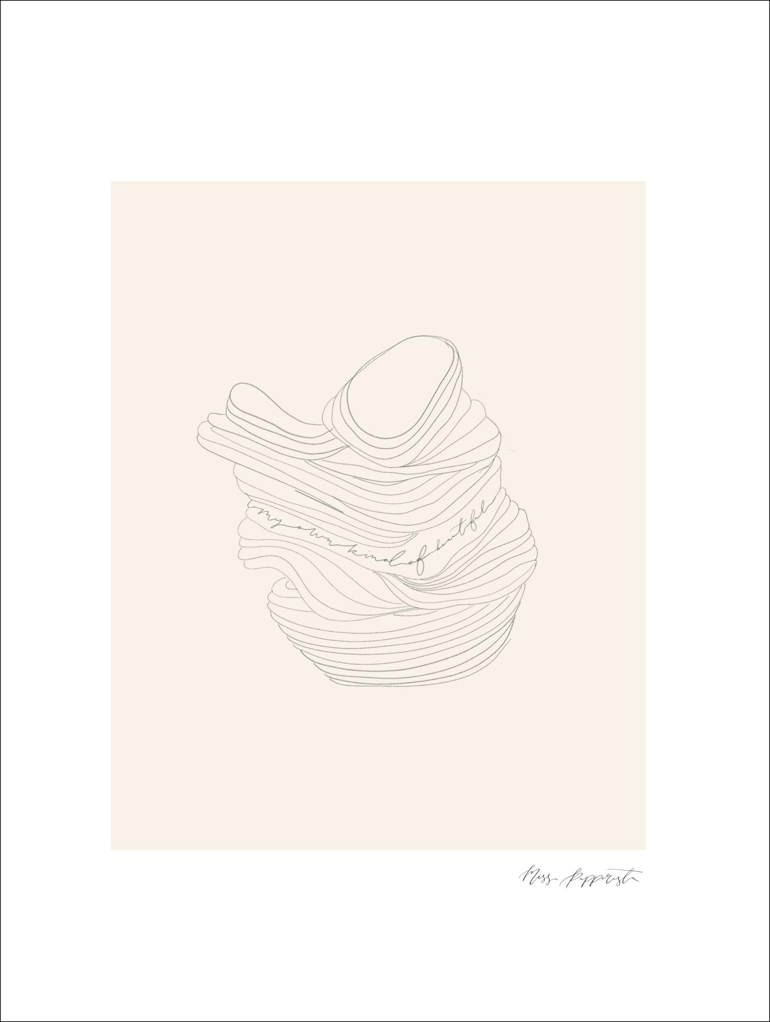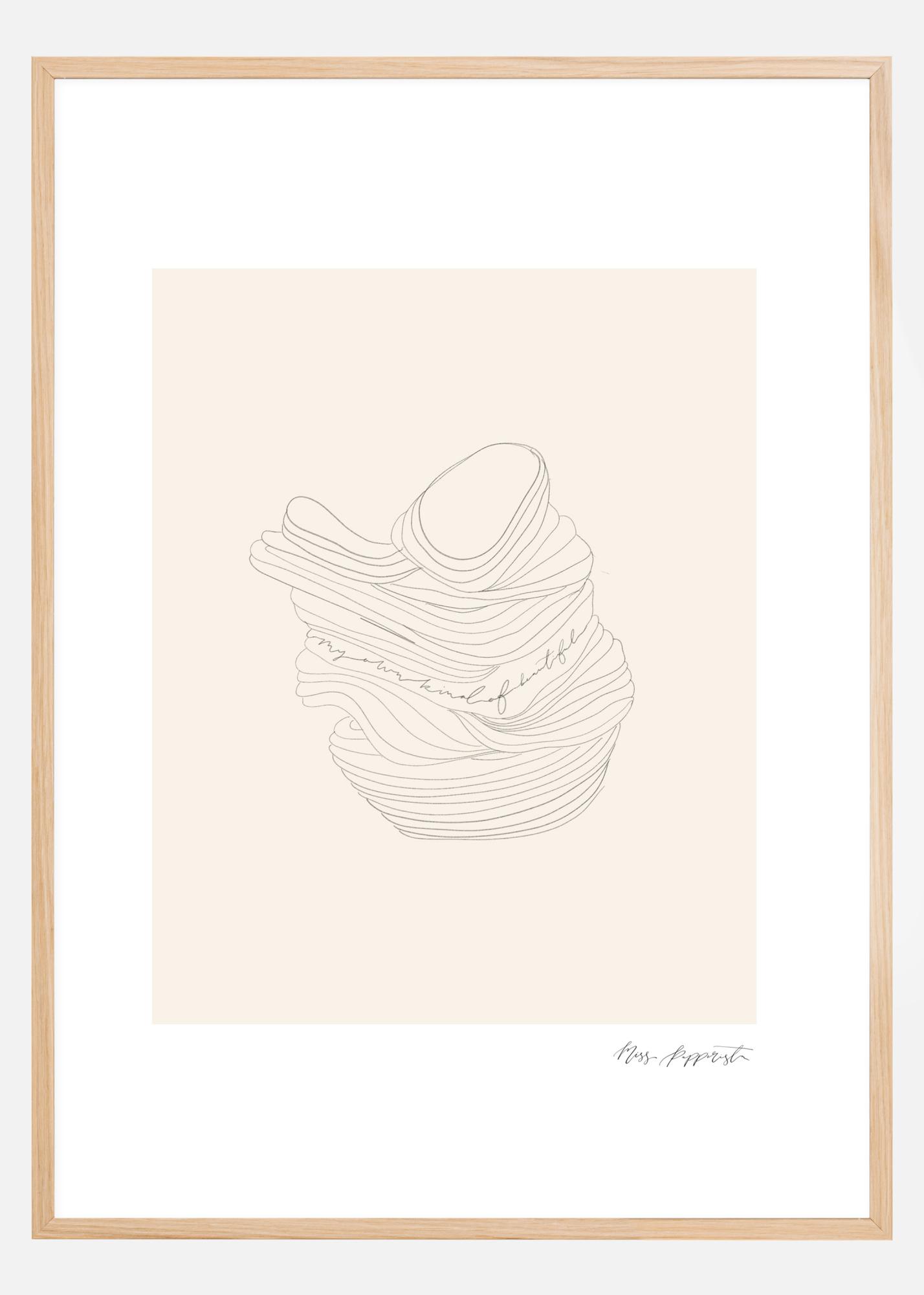 Zanimiva risba naloženih predmetov. Bež ozadje vodi pogled do rebraste sklede na sliki. Popoln tisk za začetek pogovora. Obešanje tega plakata v vaši dnevni sobi in poskušajte ugotoviti, kaj so naloženi predmeti.