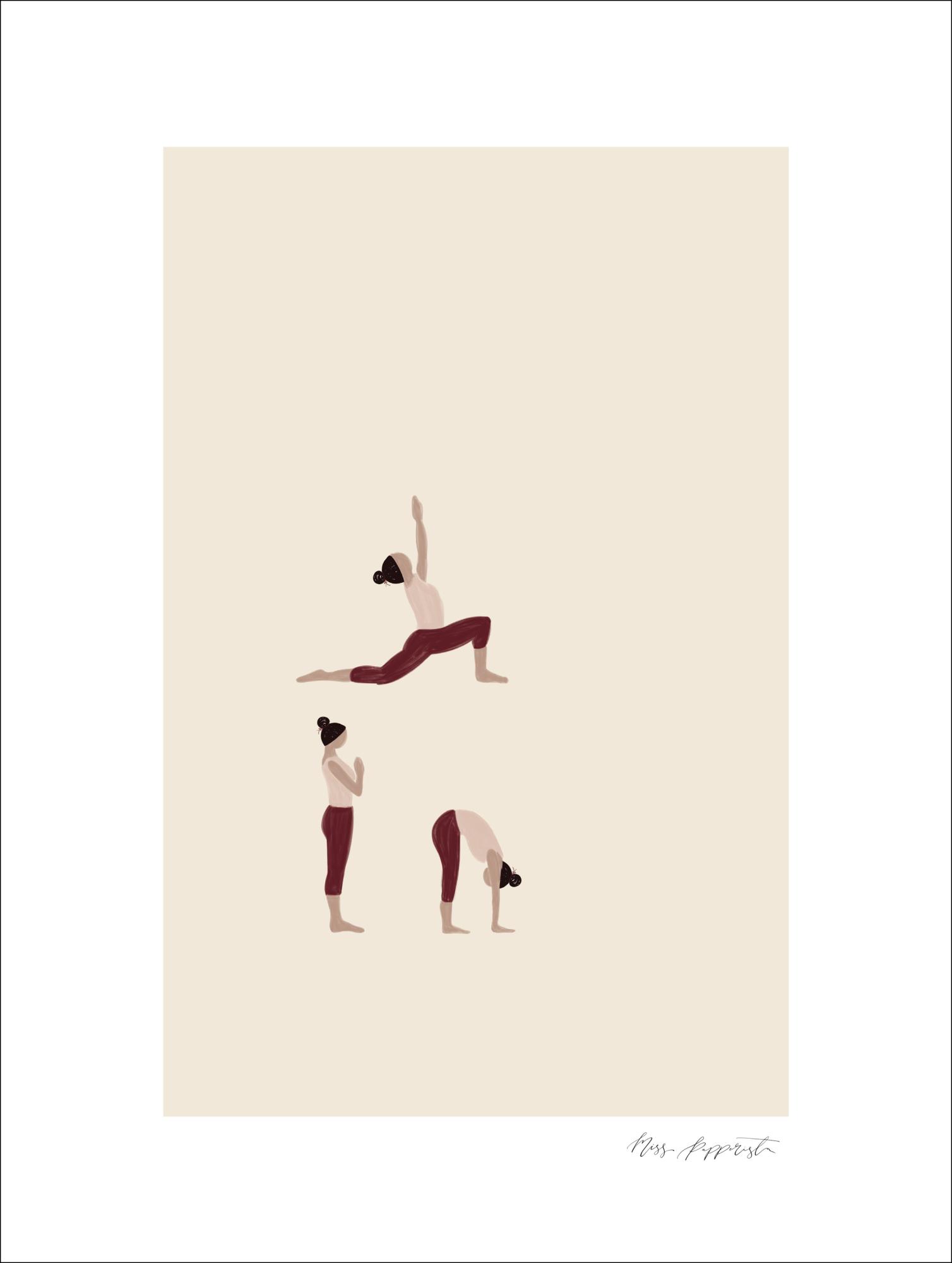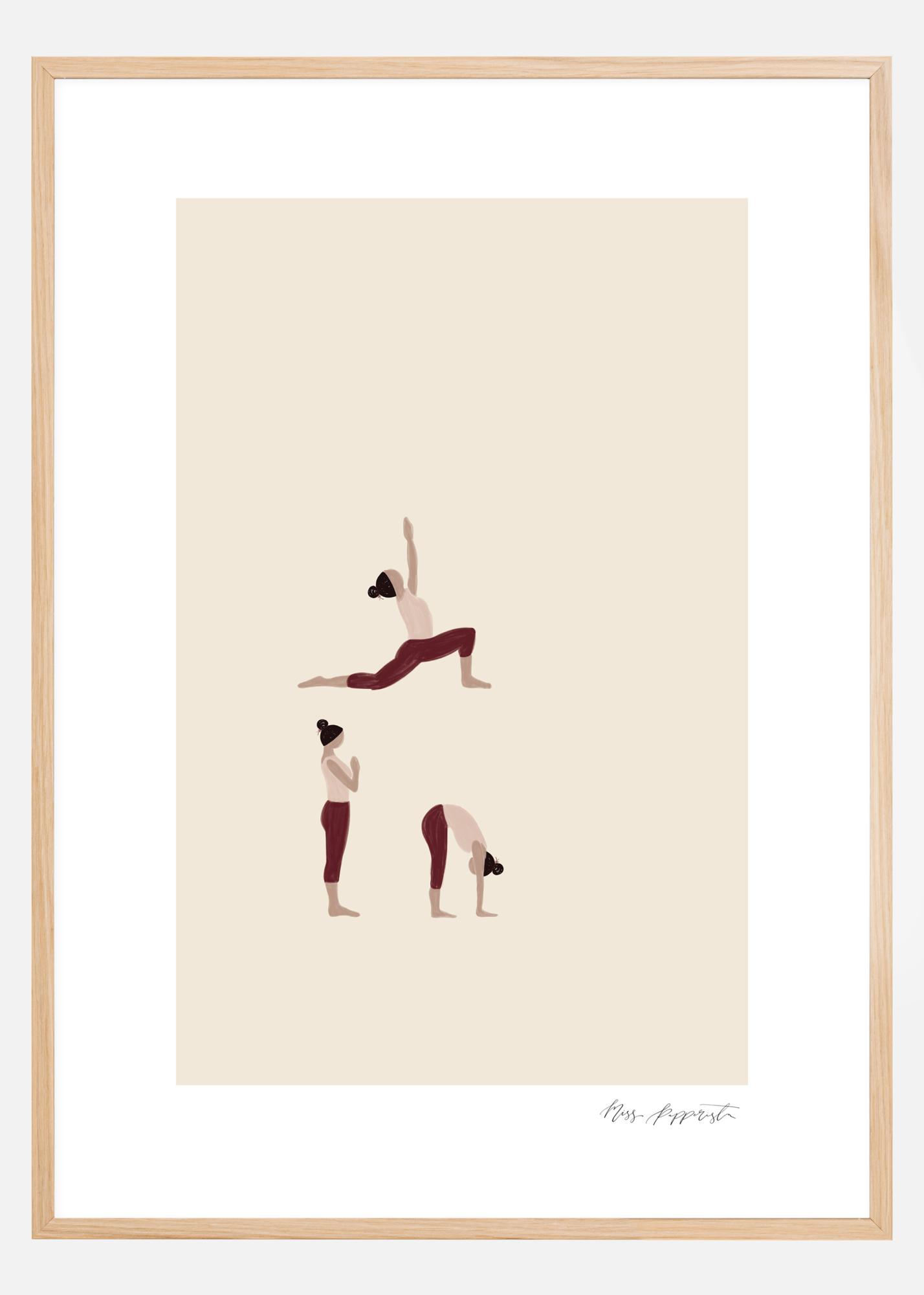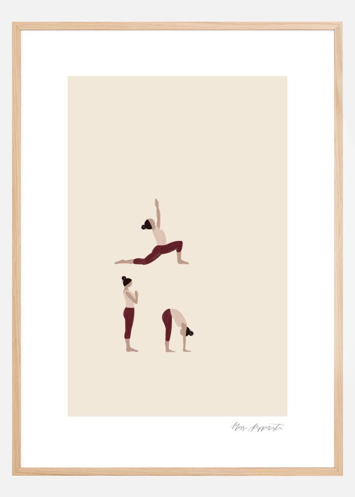 Umetniško delo z žensko, ki izvaja jogo. Na smetanasti podlagi stoji ženska v treh različnih pozah. Vse poze so popolnoma izvedene s strani ženske. Popoln poster za obešanje v razredu joge ali telovadnici.