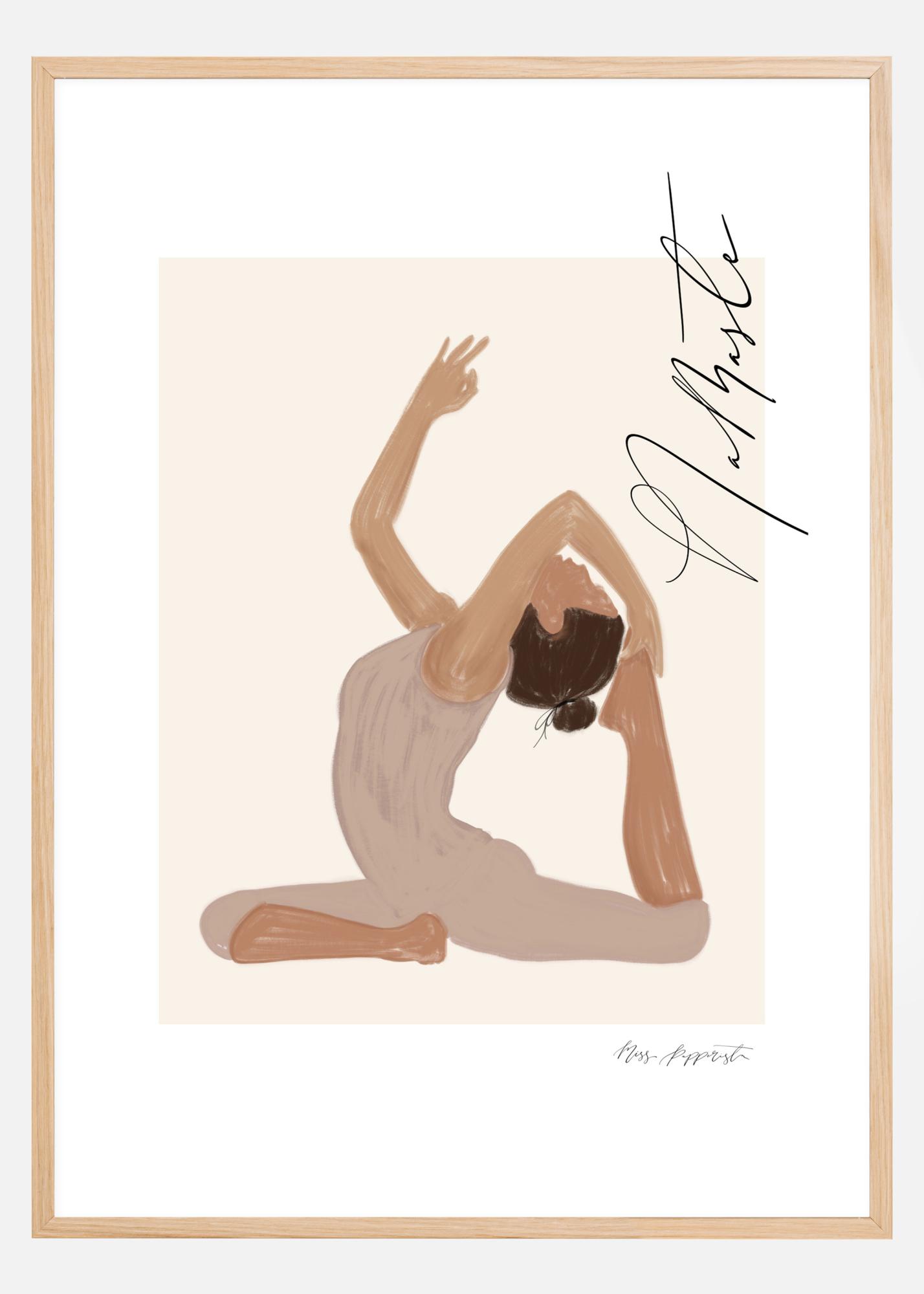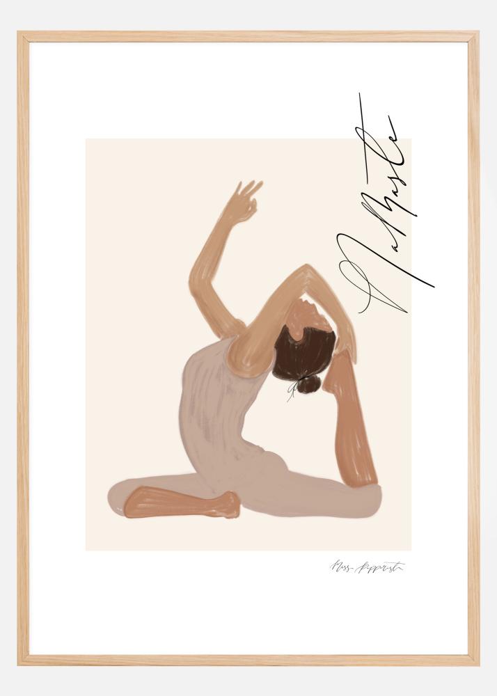 Grafični plakat v mehkih pastelnih barvah, ki prikazuje žensko v joga položaju skupaj s sporočilom "Namaste" (Klanjam se ti) v lepi kaligrafiji. Harmoničen in miren motiv, ki je uokvirjen in izpostavljen s širšim belim passepartoutom, ustvarjenim od Jenny Skantz, Miss Papperista.