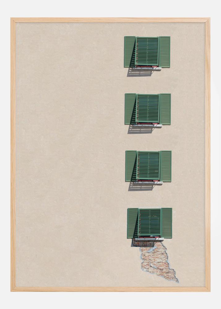 Delo, ki bi ga lahko imenovali "Sosedski spor", predstavlja radikalen kontrast med redom in kaosom prek sinhroniziranih polken v primerjavi z zadnjim oknom, kjer se zdi, da se je del stene zrušil. Enotne zelene polkne na enobarvnem ozadju nakazujejo vrsto predvidljivosti in rutine, medtem ko poškodovano okno z razkritimi opekami krši to harmonijo in uvaja zgodbo o morebitnem sporu ali zanemarjanju.