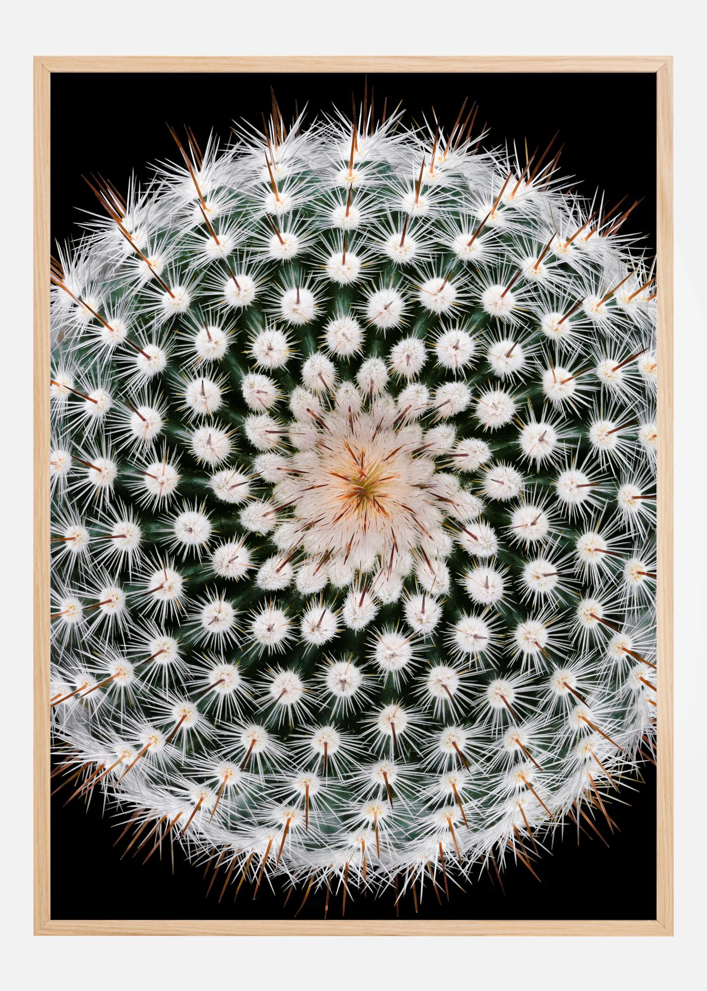 Zračna fotografija kaktusa z belimi cvetovi. Na črni podlagi temnozelena barva poudarja bele cvetove in ostre bodice. Osrednji del rastline ima rahlo rumen odtenek, kar doda dodatno barvo motivu. Popoln plakat za vse, ki obožujejo rastline.