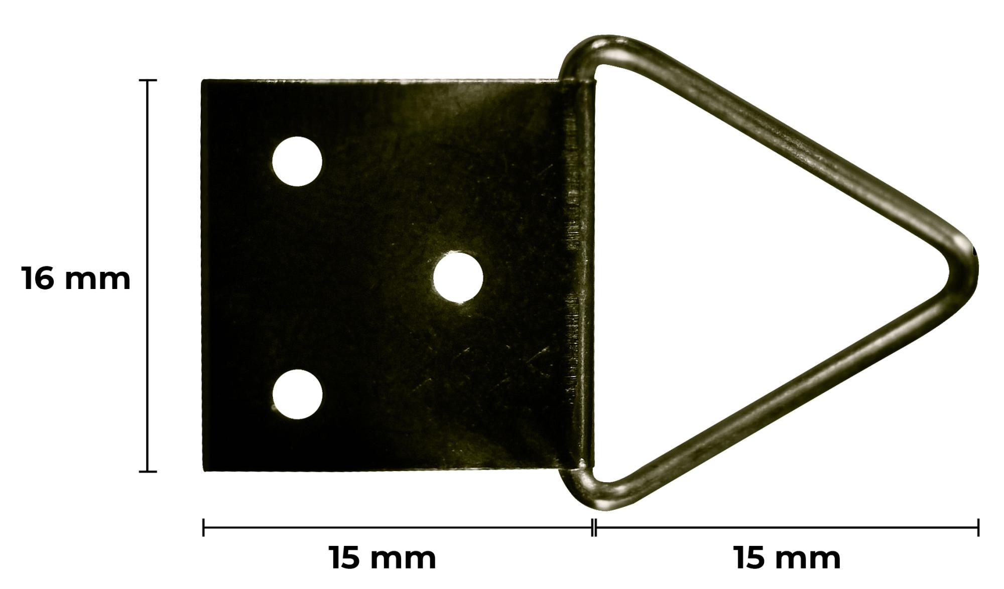 Trikotna obešanka iz medenine. Pritrjena na zadnjo stran okvirja. Lahko se uporablja kot ena obešanka ali dve obešanki, če želite uporabiti slikovno žico. Ta obešalka je odlična za nekoliko večje slike (maksimalne mere: 60x90 cm)