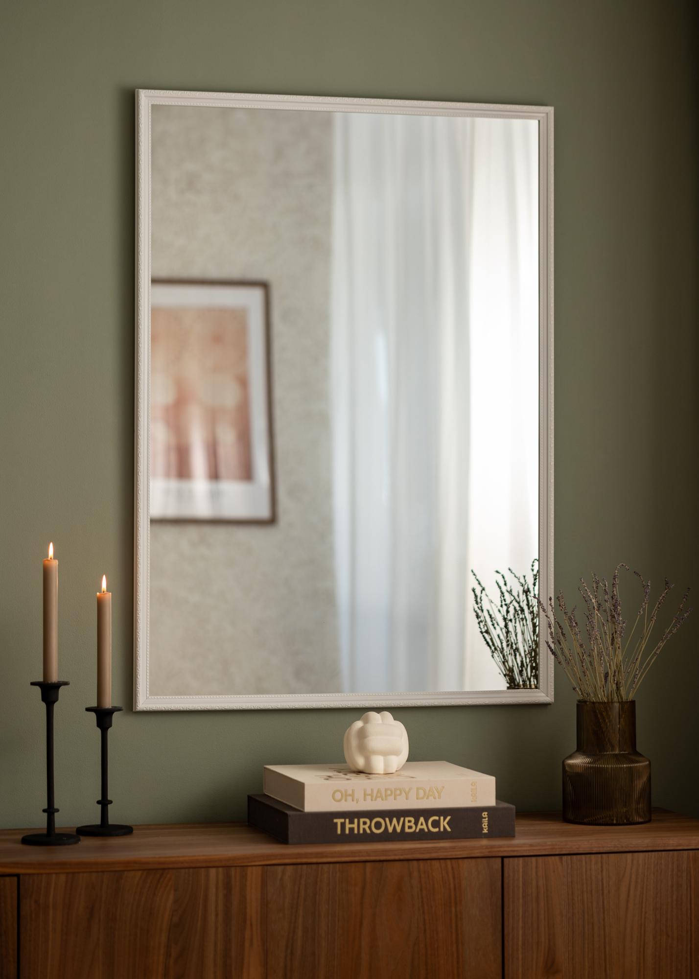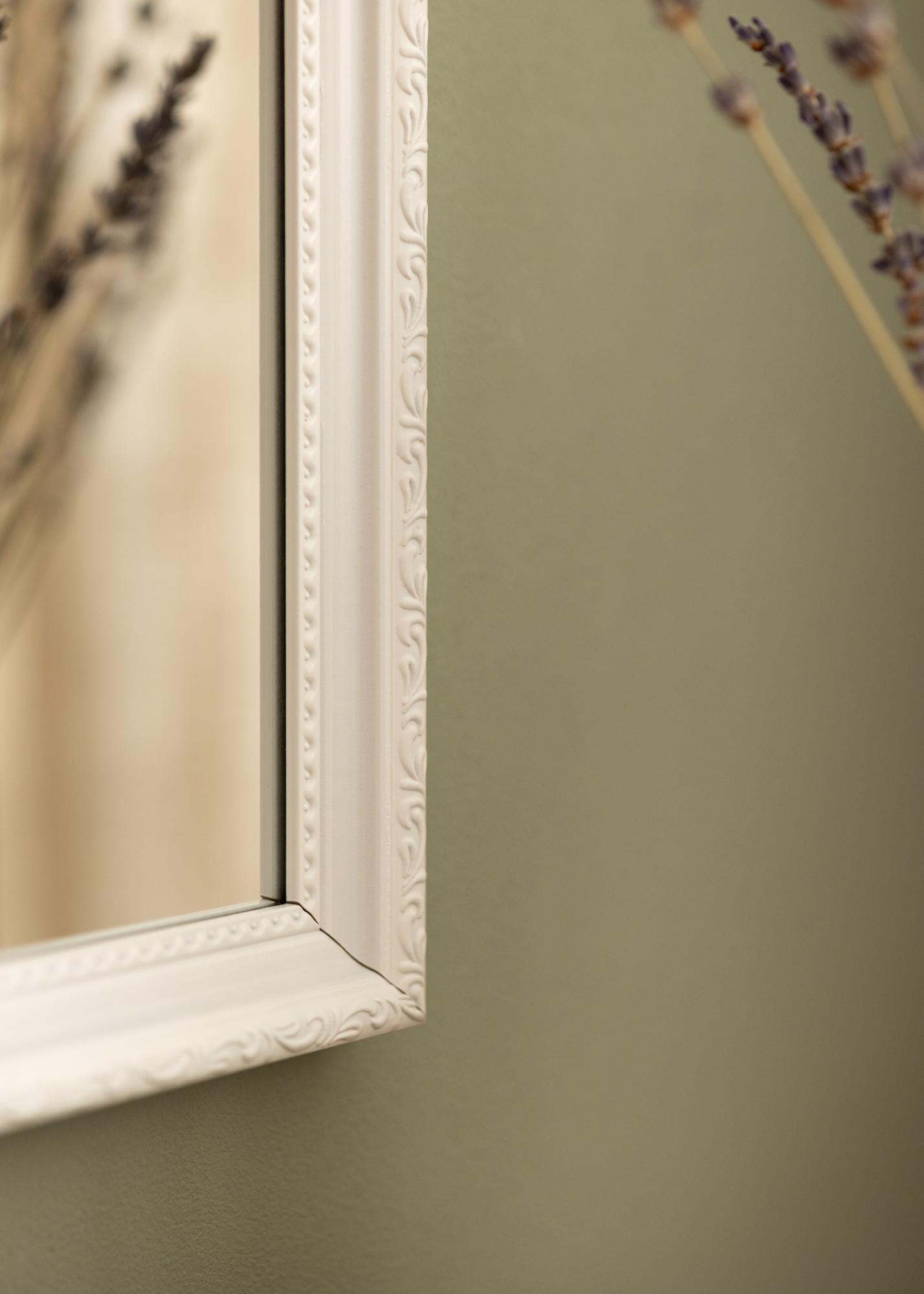 Belo ogledalo je osvežujoča podrobnost v vsakem domu, ta model pa prinaša tudi veliko eleganco! Ogledalo je izdelano iz kompozita in ima tradicionalno nebarvano zrcalno steklo. 25 mm širok okvir ima lepo vzorčan profil, ki daje zelo stilno vtis.