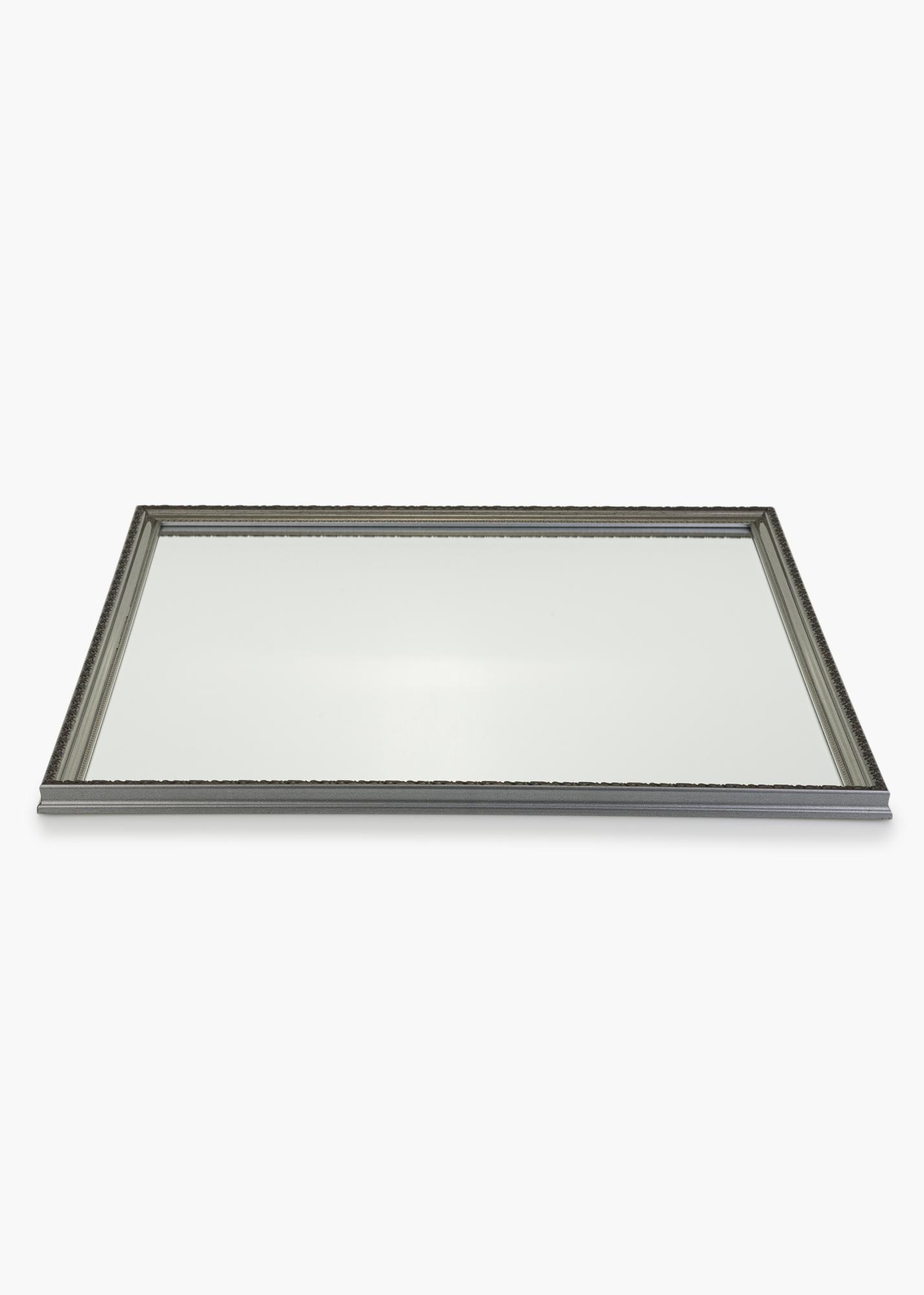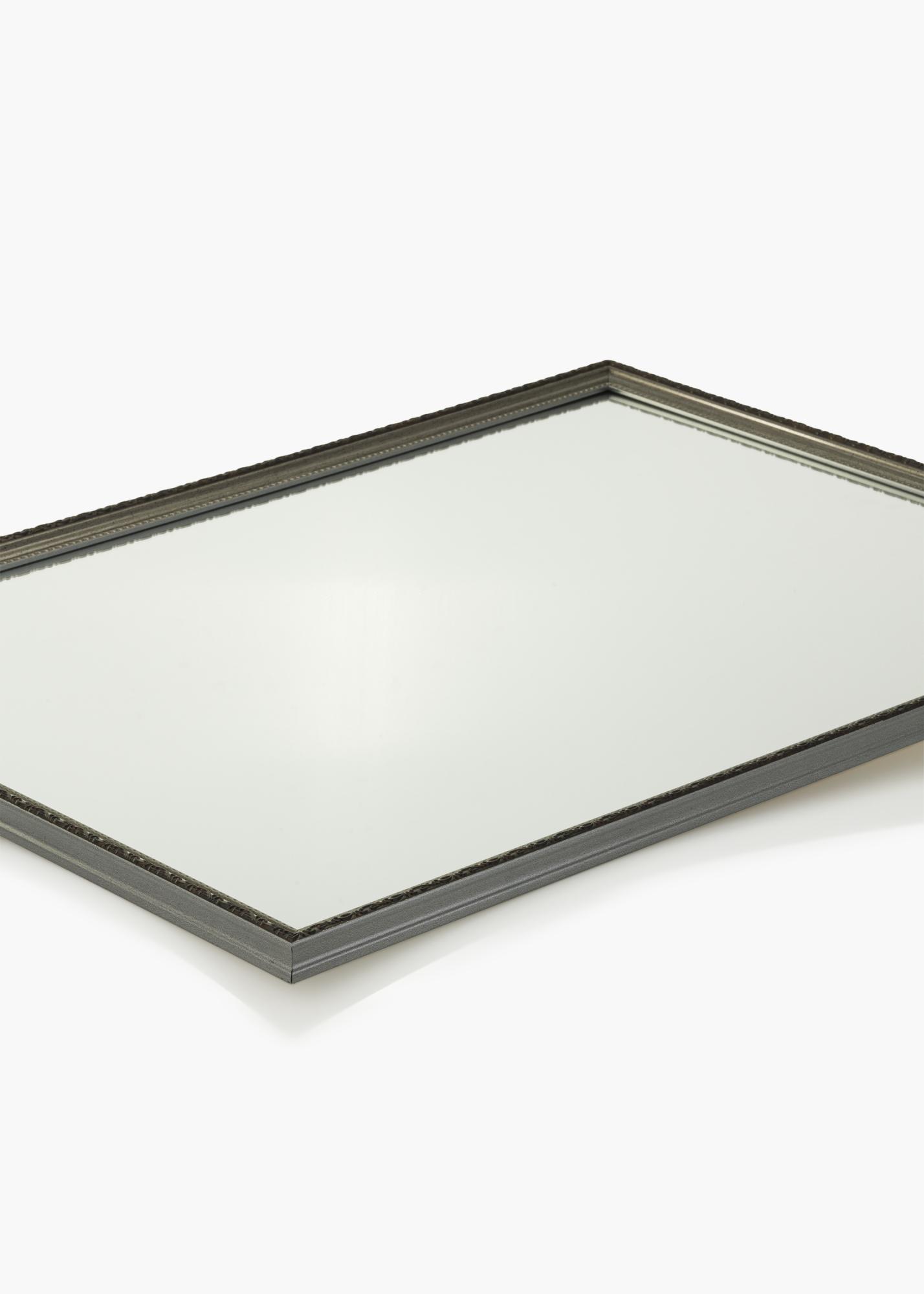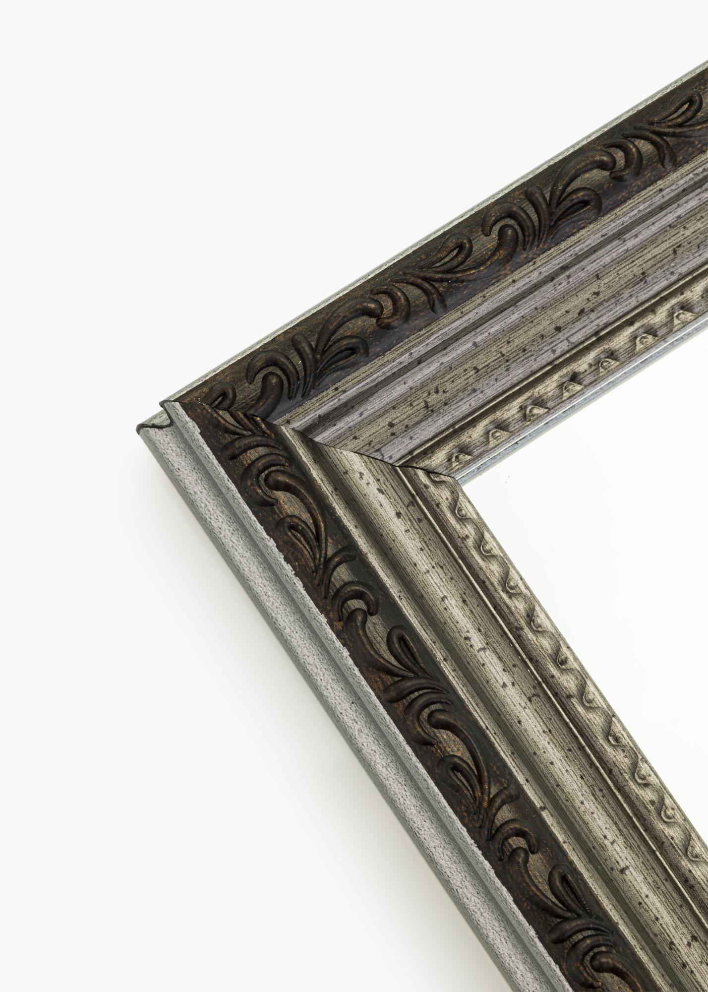 To je stensko ogledalo v elegantnem srebrnem odtenku, ki ga poudarja črn rob. Elegantna barva ogledala je popolnoma združena z okrašeno profilom, katerega vzorec pomaga ustvariti zelo prefinjeno celoto. Okvir je širok 25 mm in izdelan iz kompozita.