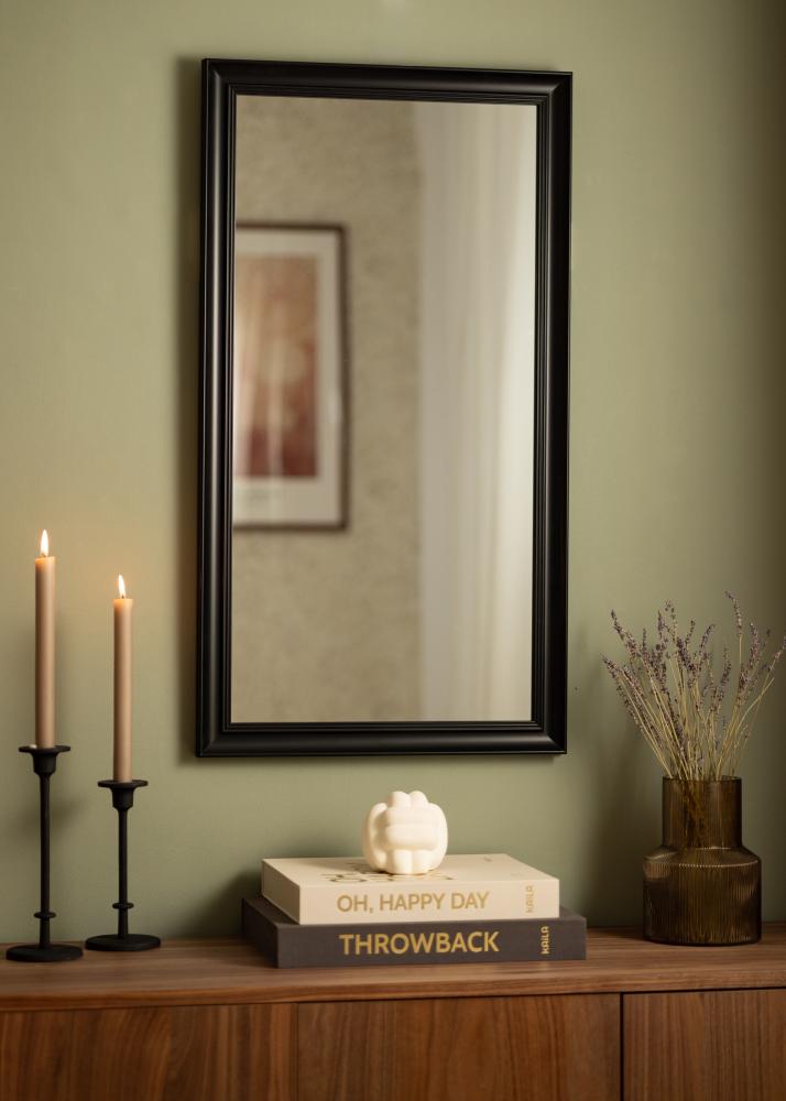 Alice črna je ogledalo, katerega okvir ima klasično strogo zasnovo z ravnimi linijami, ki so oblikovane za osredotočanje na motiv.
