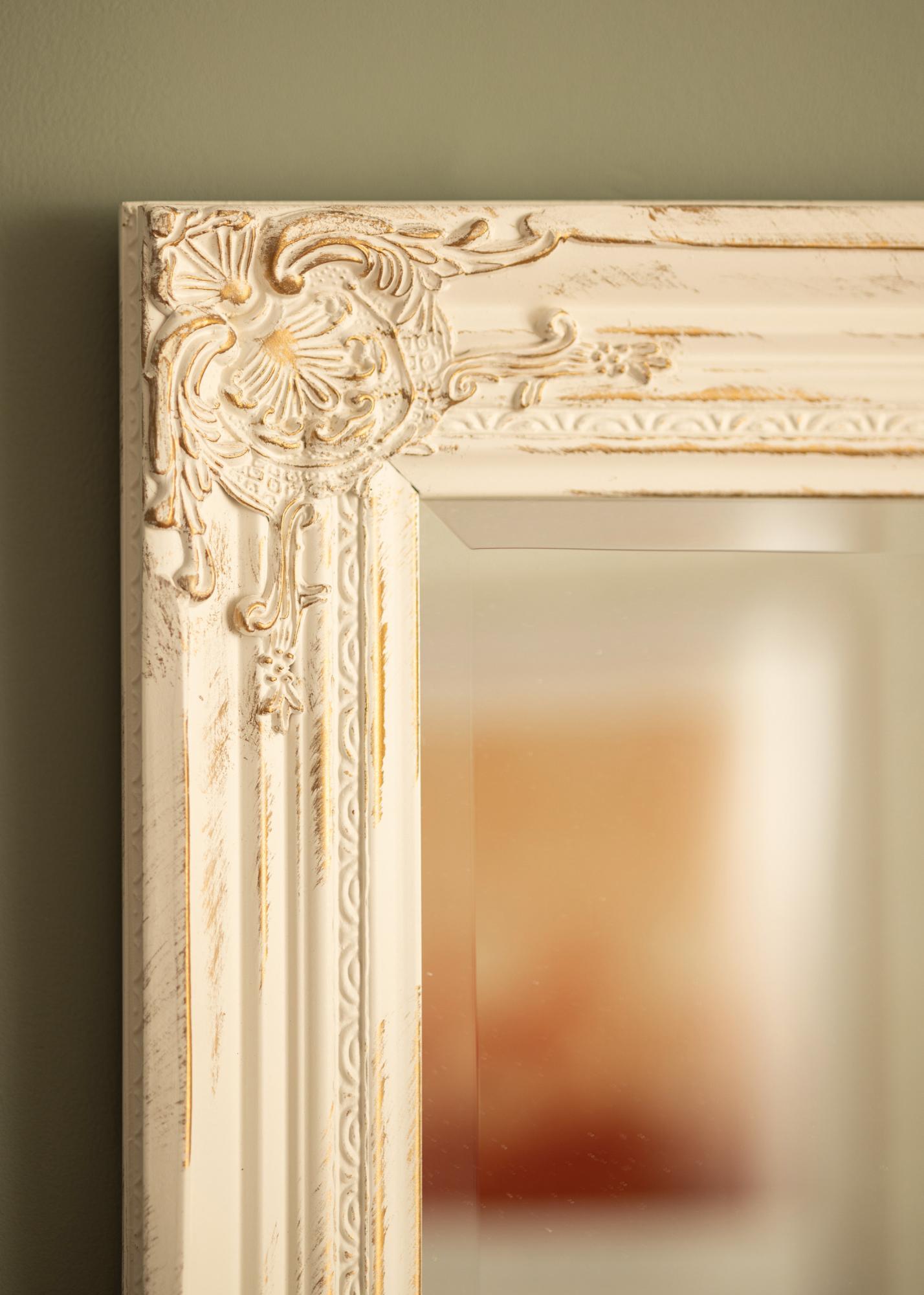 Zrcalo Antique Bela je stensko ogledalo s tradicionalno obliko in formatom. Ima lesen okvir z lepim klasično oblikovanim okrasjem, ki je vlit v mavec in nato nanesen na okvir. Ta okvir naredi ogledalo čudovit okras, ki bo pritegnil poglede.