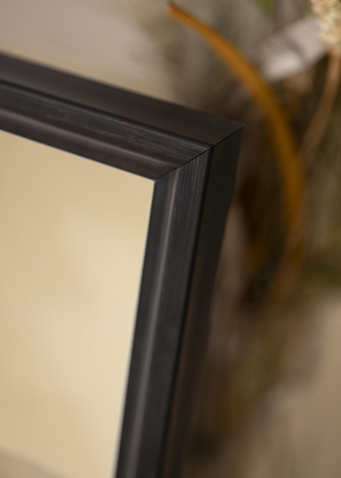 Tradicionalen okvir ogledala v temni črno-rjavi barvi, ki je bližje črni kot rjavi. Odlična izbira, ko iščete po meri izdelano ogledalo v temnem odtenku, kjer je vidna struktura lesa, kar daje bolj živahno ogledalo v primerjavi s popolnoma črnim profilom.