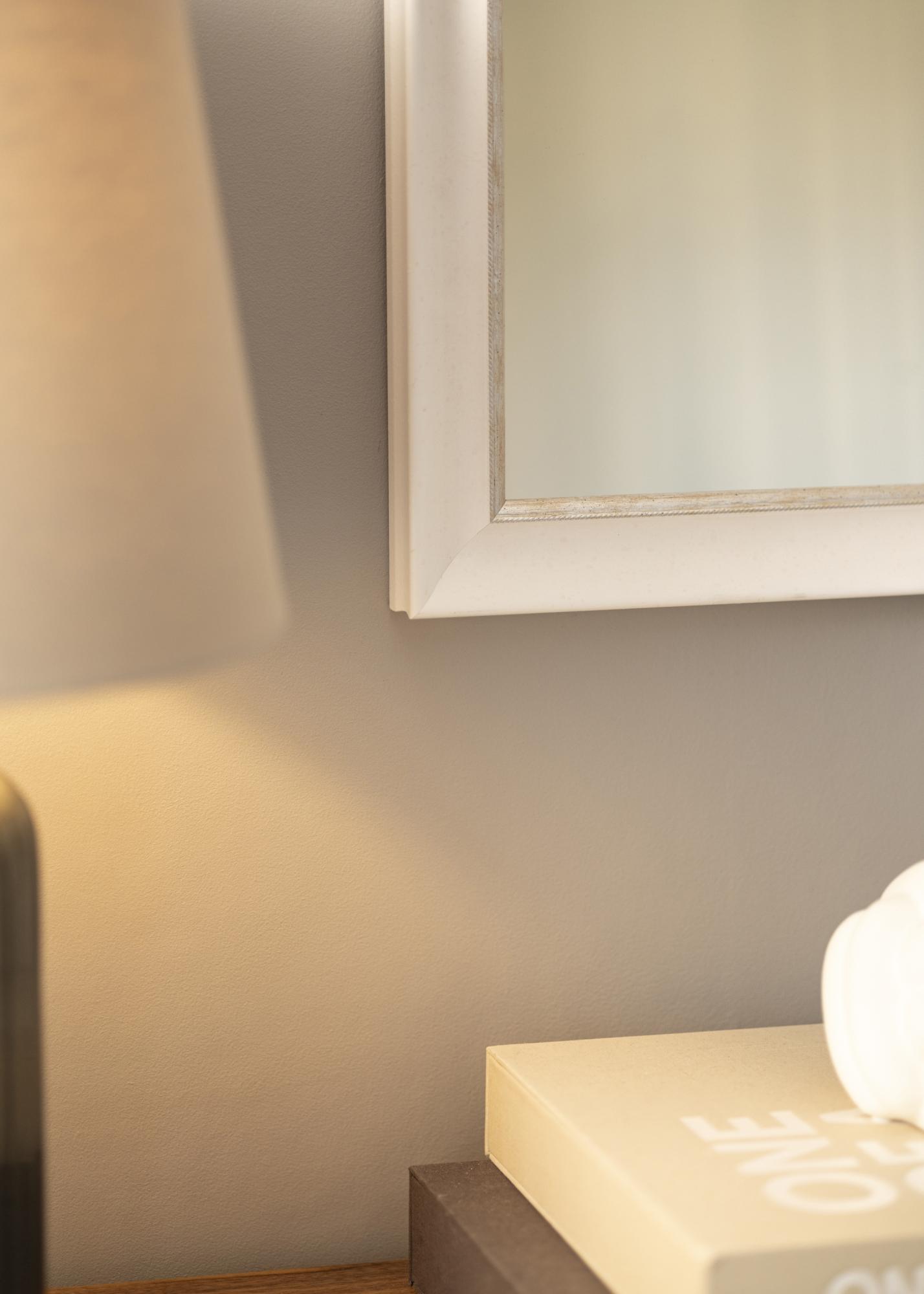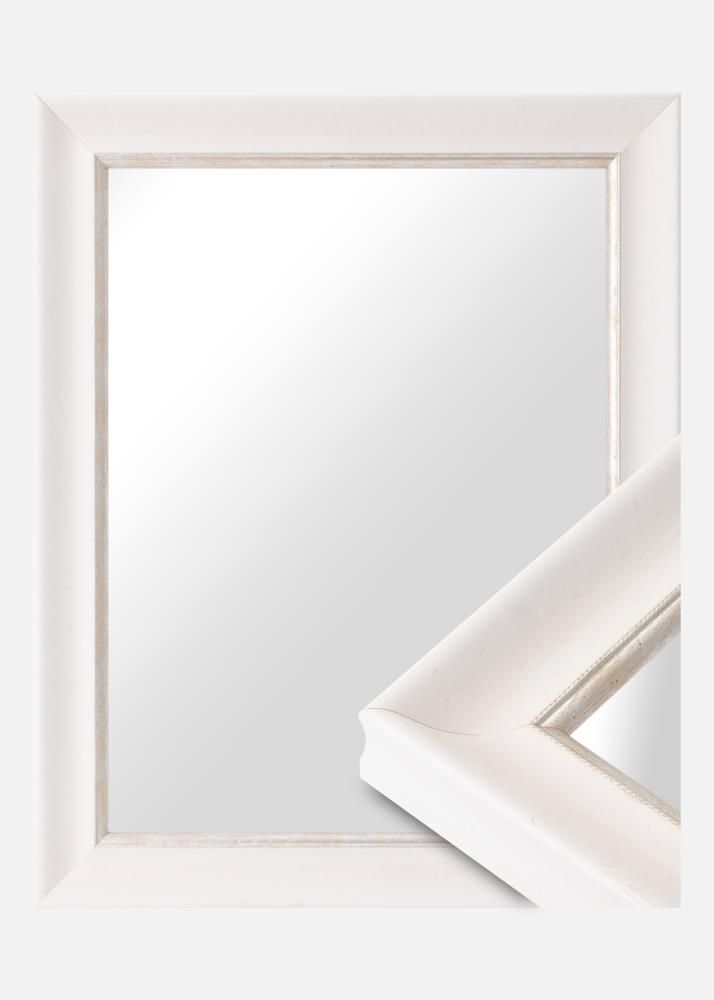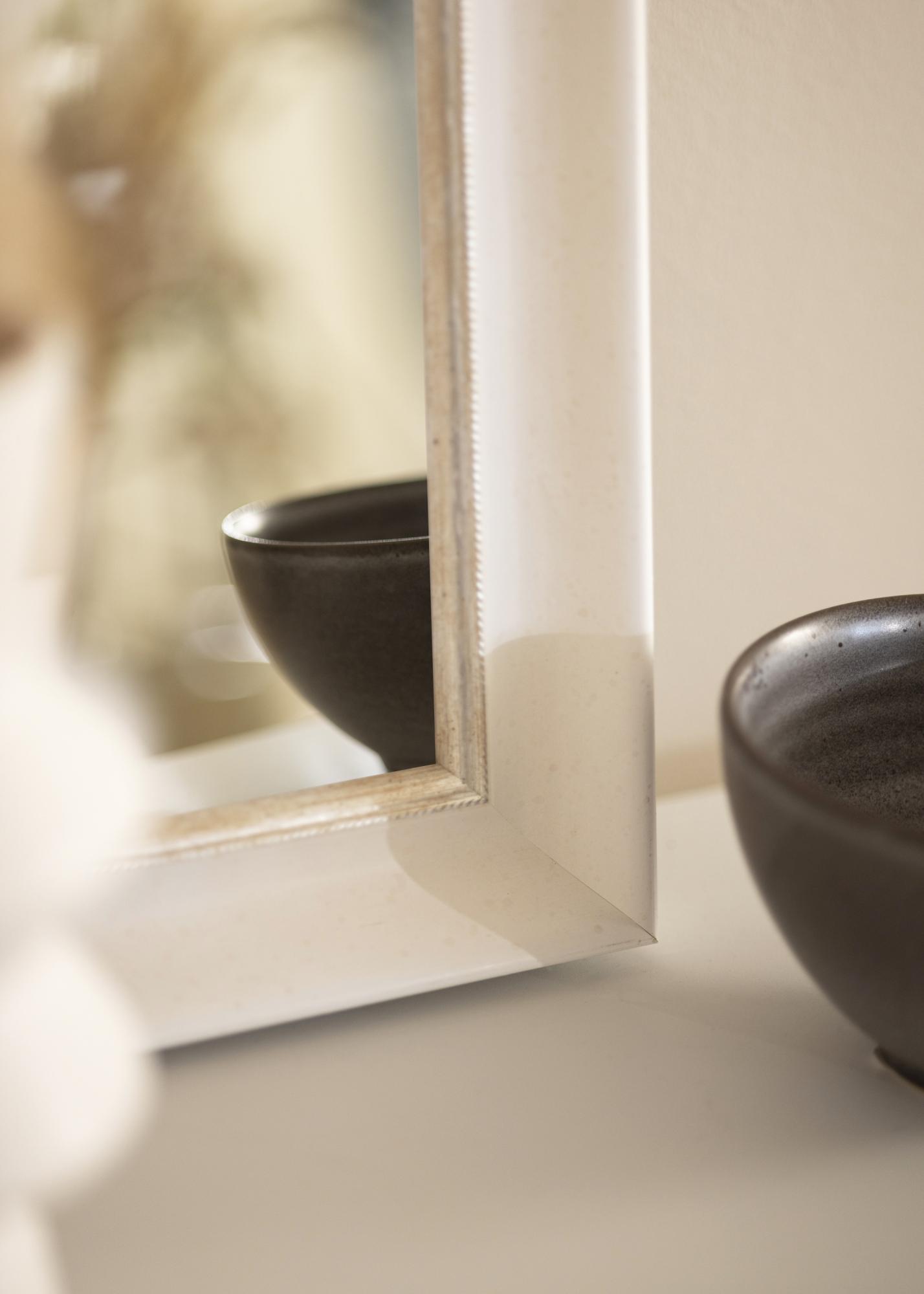 Trdno ogledalo poljubne velikosti z belo klasično profilno. Najbližje motivu je elegantni srebrni rob, ki daje ogledalu dodatno sijaj.