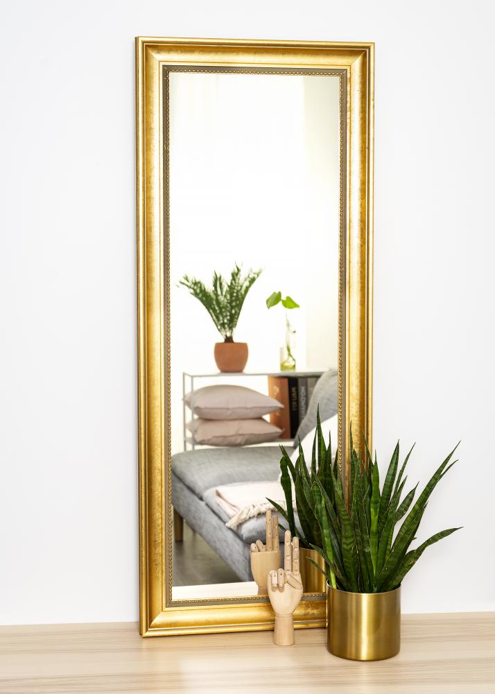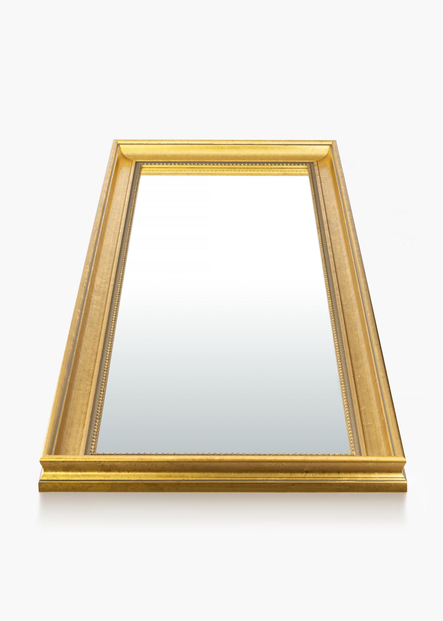 Nabavite čudovito ogledalo in notranjost hodnika, dnevne sobe ali kopalnice naredite še bolj razkošno. To elegantno ogledalo je na voljo v več različnih velikostih, zato zlahka najdete tisto, ki ustreza vašemu namenu. Okvir ogledala ima klasičen dizajn s širokim robom in diskretnim bisernim vzorcem tik ob steklu. Les prihaja iz trajnostnega gozdarstva in je pobarvan v čudoviti zlati odtenek.