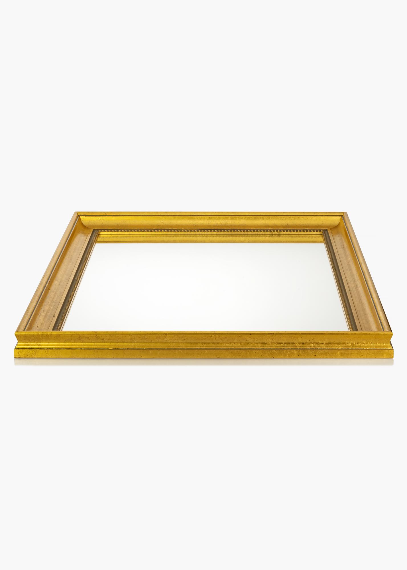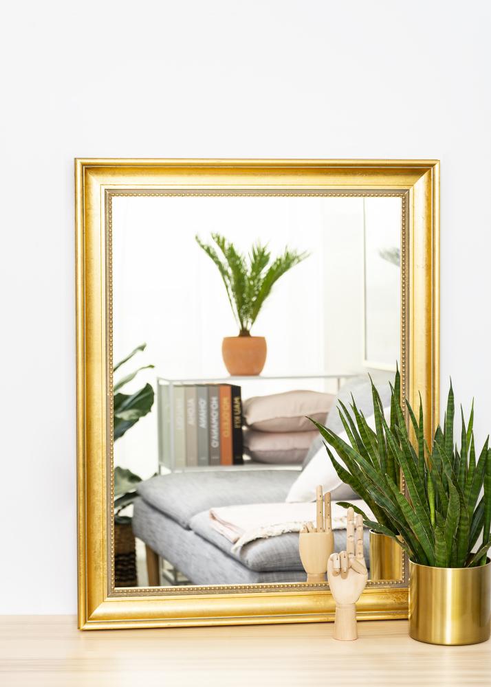 Pridobite si elegantno ogledalo in naredite notranjost hodnika, dnevne sobe ali kopalnice še posebej razkošno. To stilsko ogledalo je na voljo v več različnih velikostih, tako da zlahka najdete eno, ki ustreza vašemu namenu. Okvir ogledala ima klasičen dizajn s širokim okvirjem in diskretnim bisernim vzorcem blizu stekla. Les prihaja iz trajnostnega gozdarstva in je pobarvan v čudovitem zlati odtenku.