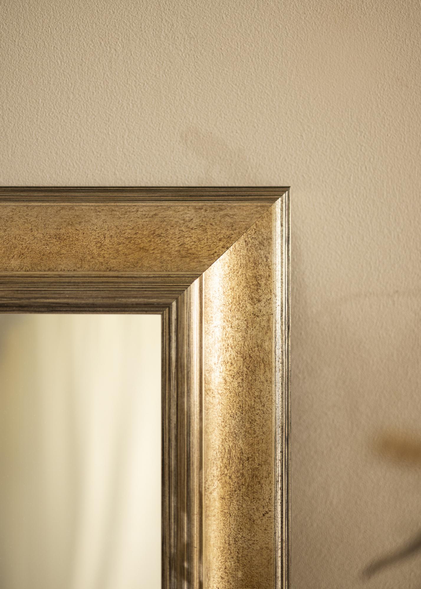 Temen srebrni odtenek zrcala daje klasičen in brezčasen občutek, kar olajša ujemanje z različnimi notranjimi slogi. Krtačena površina ima subtilne barvne prehode, ki poudarjajo tako globino kot strukturo, kar daje zrcalu edinstven značaj. Tanke, linearne dekoracije vzdolž robov dodajo dodatno dimenzijo elegance in prefinjenosti.