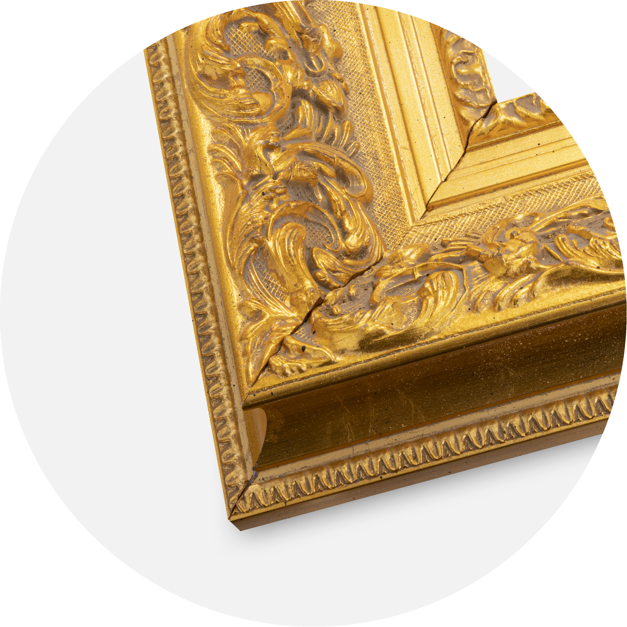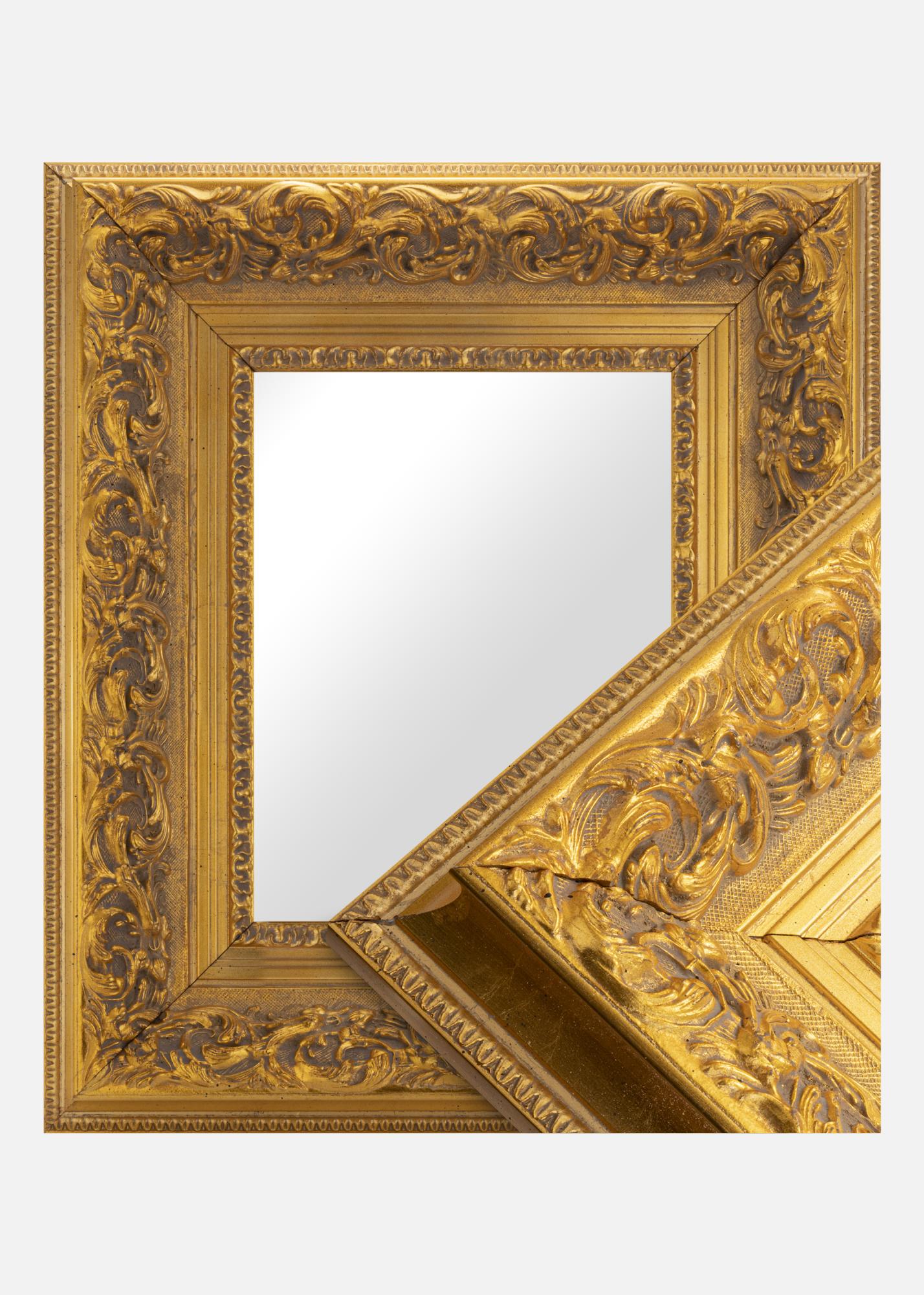 Ogledalo Birmingham Zlato je naročilno ogledalo, ki ga izdelujemo mi, kar vam omogoča, da ga dobite v natančnih dimenzijah, ki jih želite. S svojo globoko zlato tonom in klasično baročno zasnovo je to ogledalo vpadljiv detajl v vašem domu. Okvir, širok 152 mm, je okrašen z vijugastimi okraski in izklesanimi listnimi vzorci, kar ustvarja eleganten in brezčasen videz.