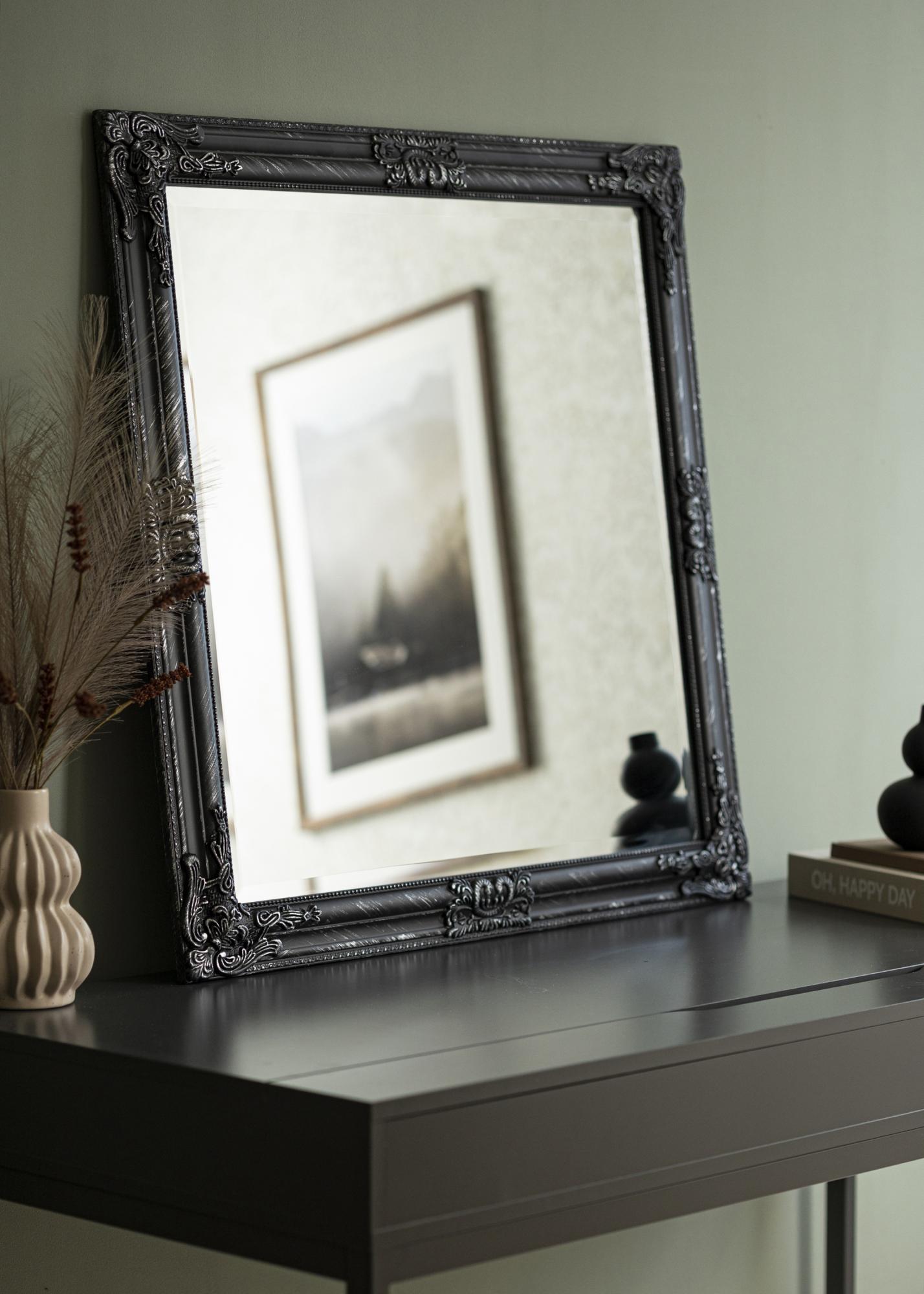 To ogledalo se odlikuje s kvadratno obliko, ki ustvarja strukturo in red v prostoru, obdano z temnim, detajliranim okvirjem, ki daje izrazit in prefinjen videz. Črn okvir je okrašen z lepimi detajli, ki nas spomnijo na razkošno baročno estetiko, kar vašemu interierju doda luksuzno in dramatično noto.