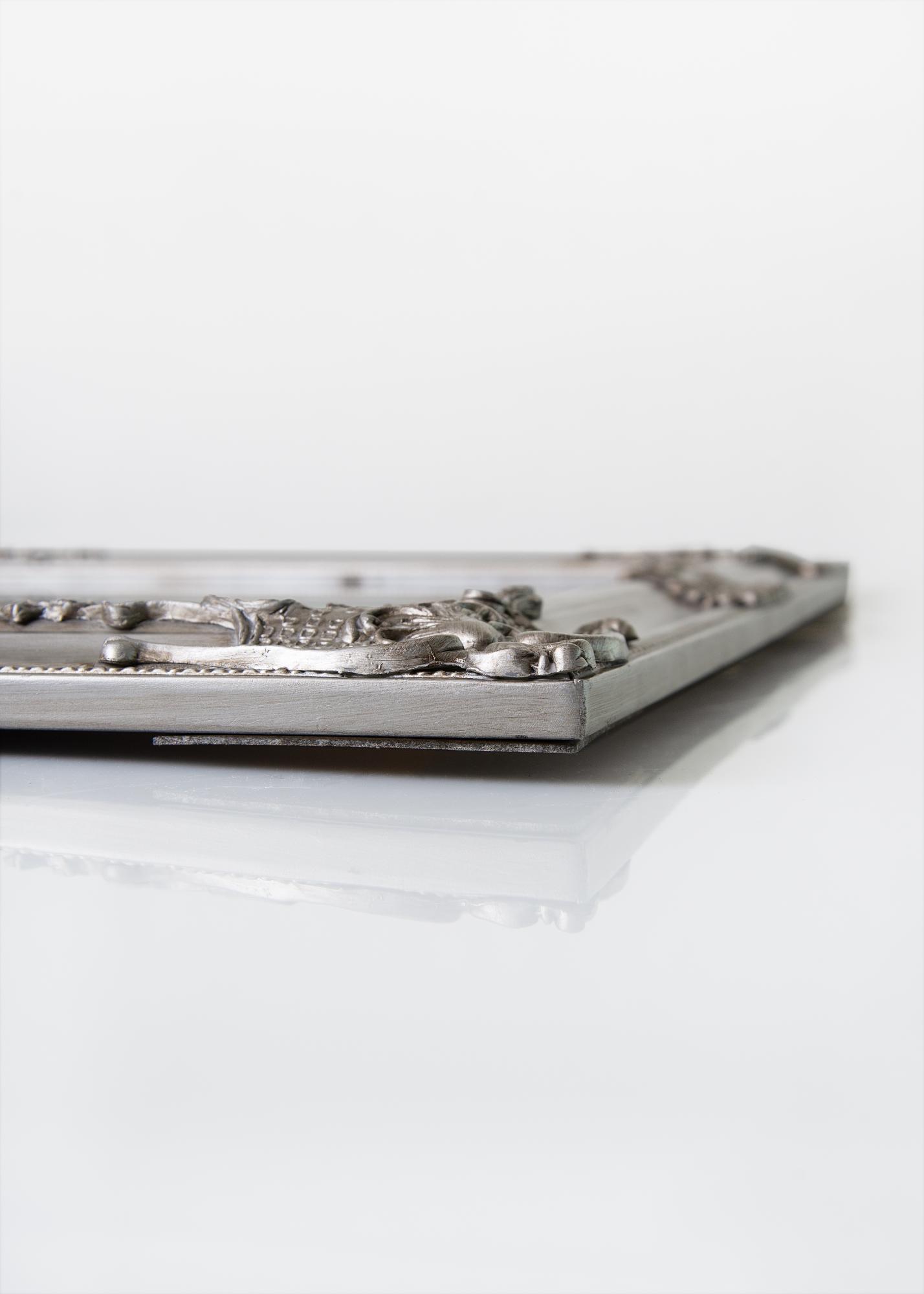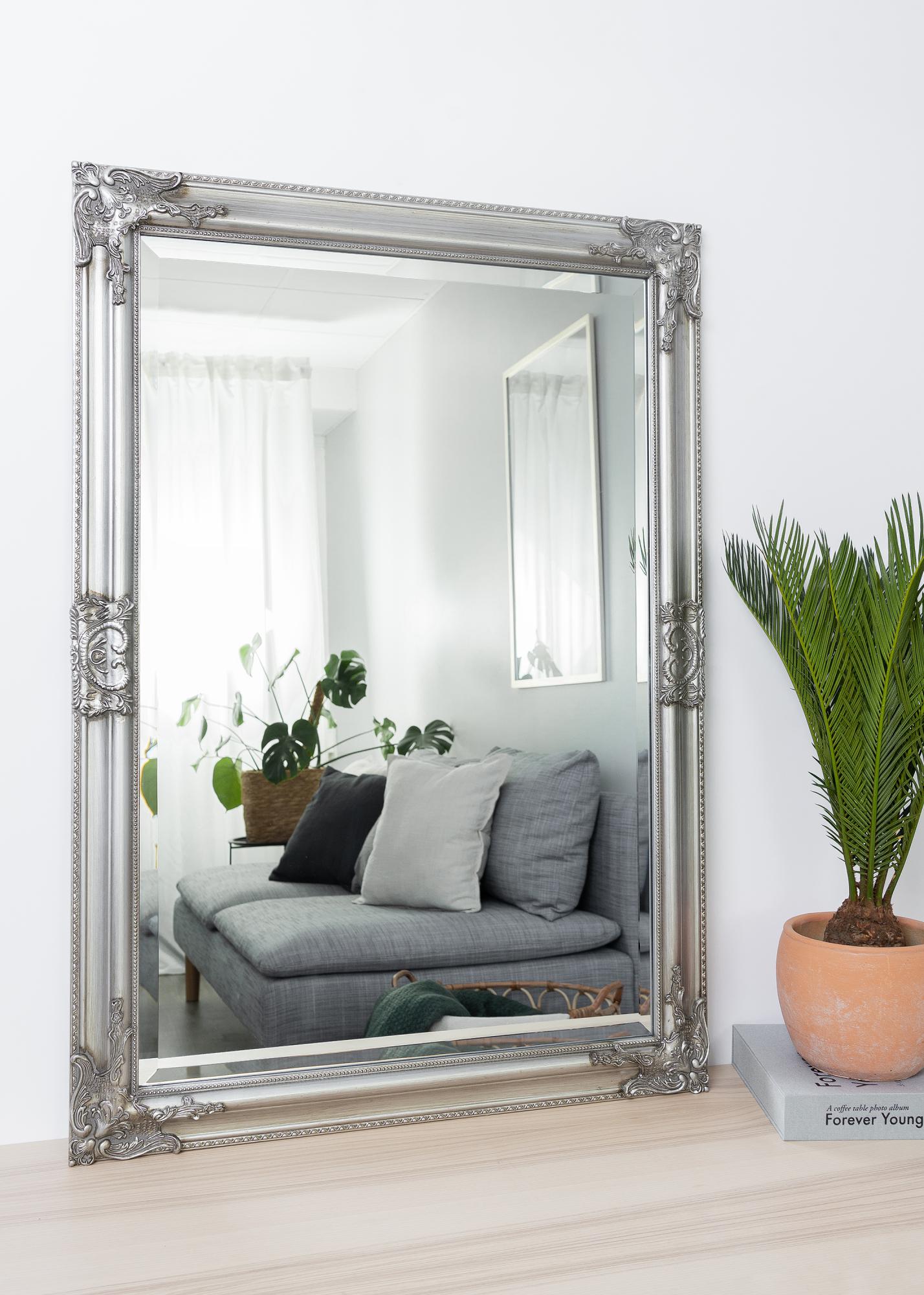 Serija ogledal Bologna Silver ima latinski dizajn z bogato dekoracijo v kotih in na sredini stranic okvirja. Malo ožji okvir kot pri mnogih drugih ogledalih v tem slogu. Okvir je izdelan iz lesa, dekor pa je bil ulit v mavec, preden je bil nanesen na okvir.