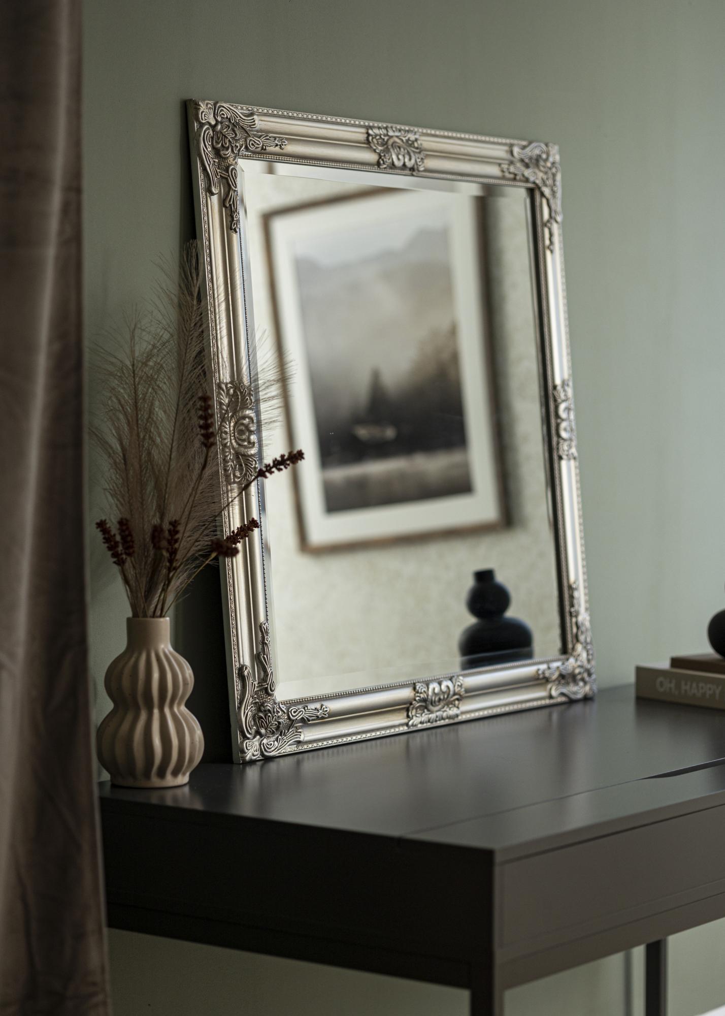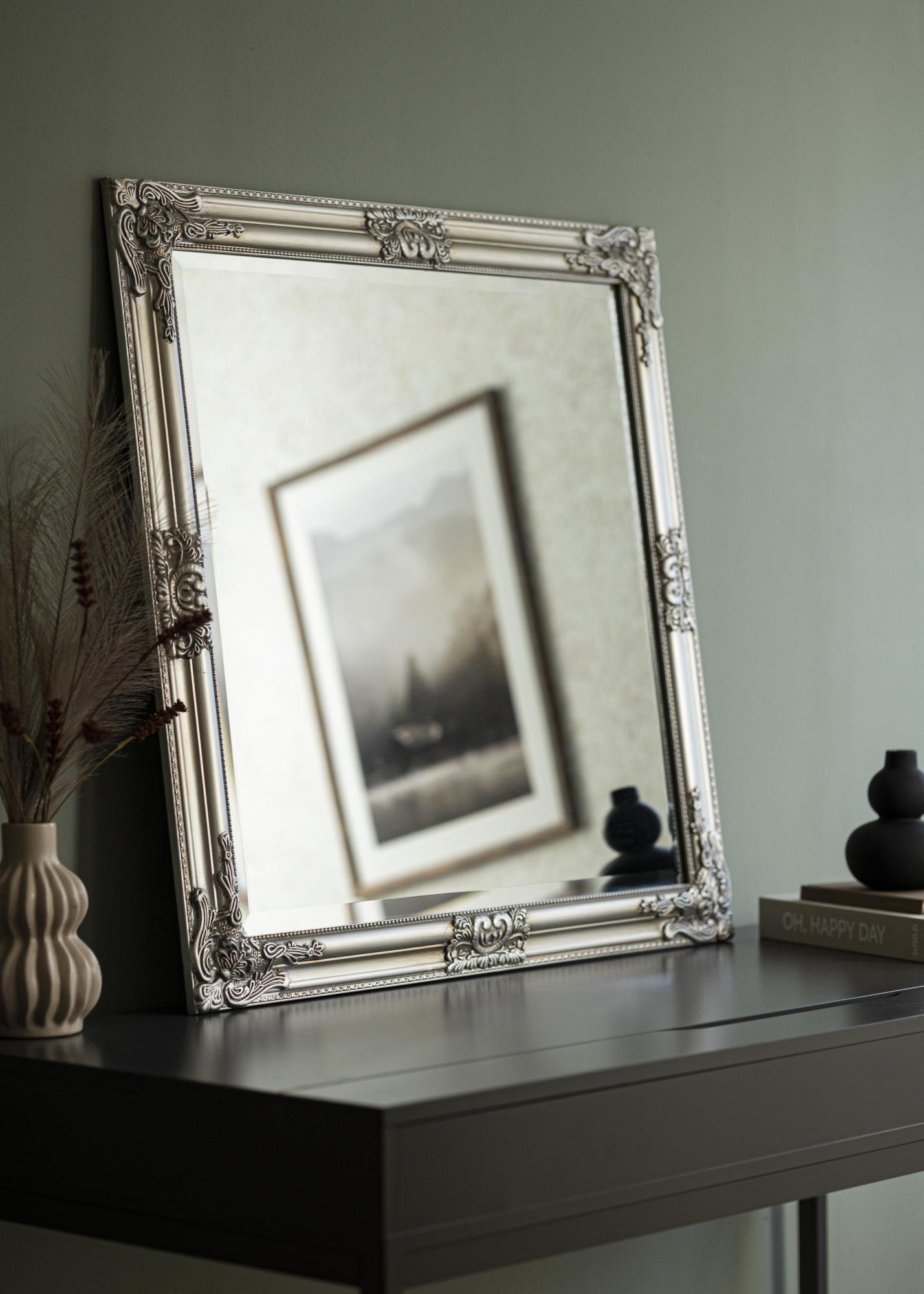 Okvir tega ogledala je pravi poudarek, bogat z detajli baročnih okraskov, ki prostoru dodajo pridih luksuza in zgodovine. Kvadratna oblika zagotavlja simetrično in uravnoteženo estetiko, ki dopolnjuje večino stilov notranjosti. Srebrna barva okvirja ogledala poudarja njegovo elegantno izražanje in ga naredi za vsestranski element v domu.