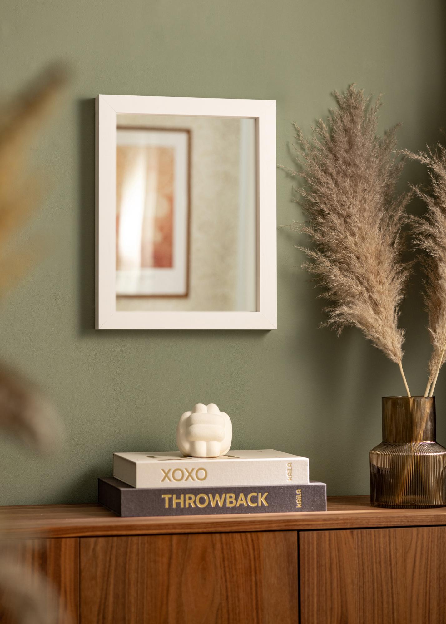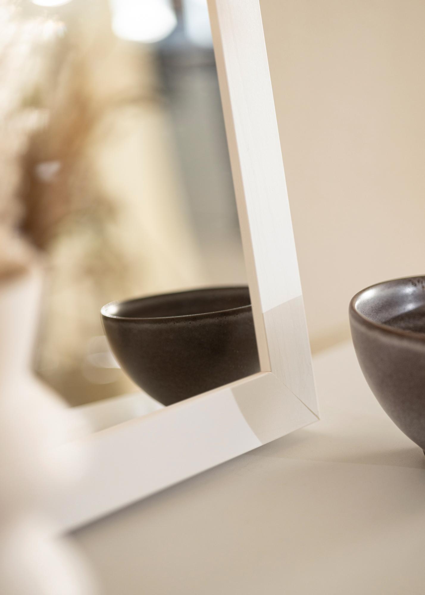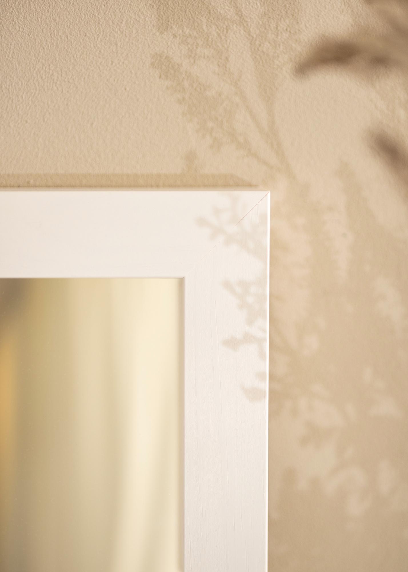 Okvir iz finske smreke, ki je pobarvan z belo barvo neposredno na les za pristnejši občutek lesa. "Boxholm Belo" ima globino 43 mm, kar pomeni, da ogledalo nekoliko štrli od stene in s tem ustvarja čudovit 3D učinek.