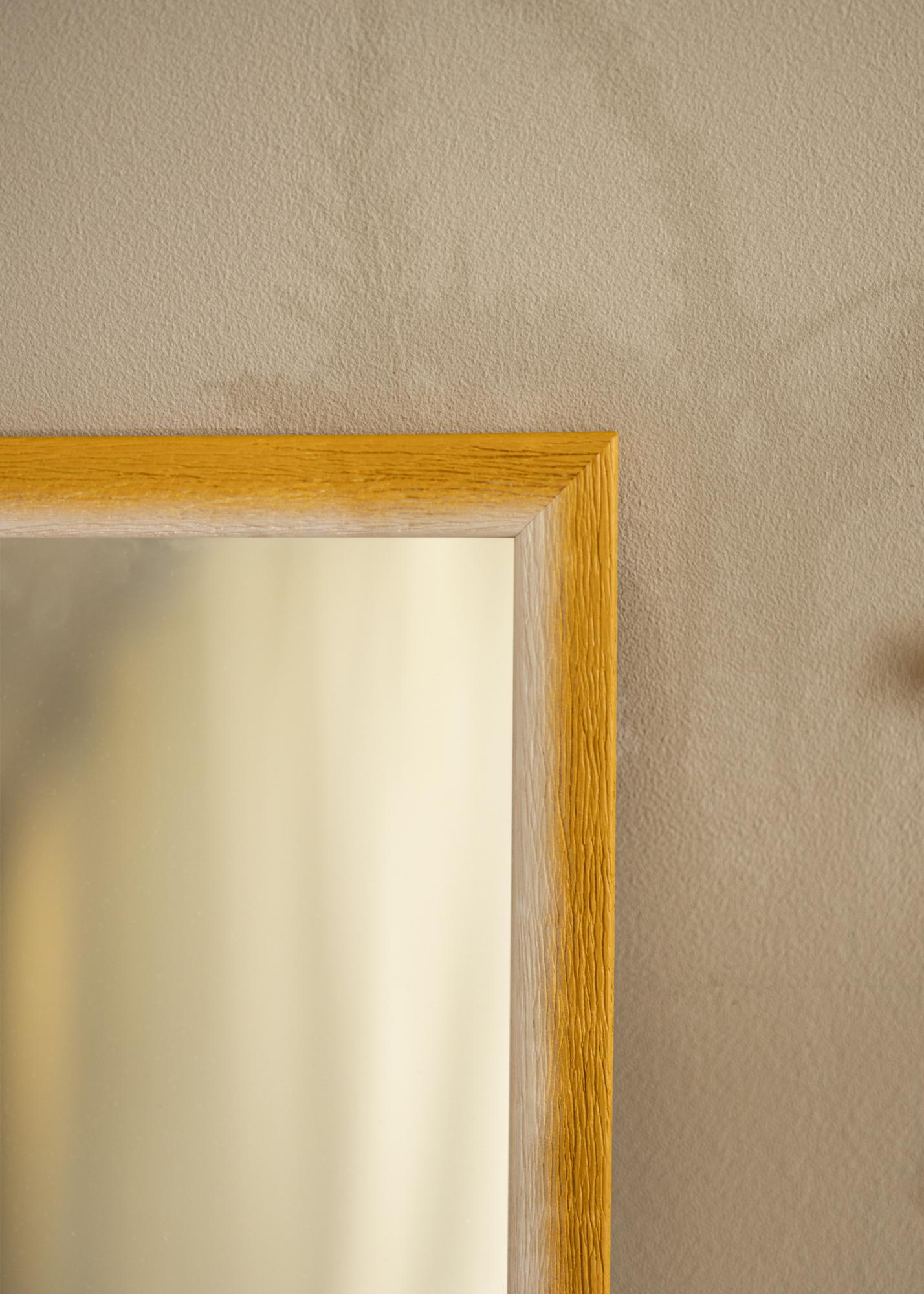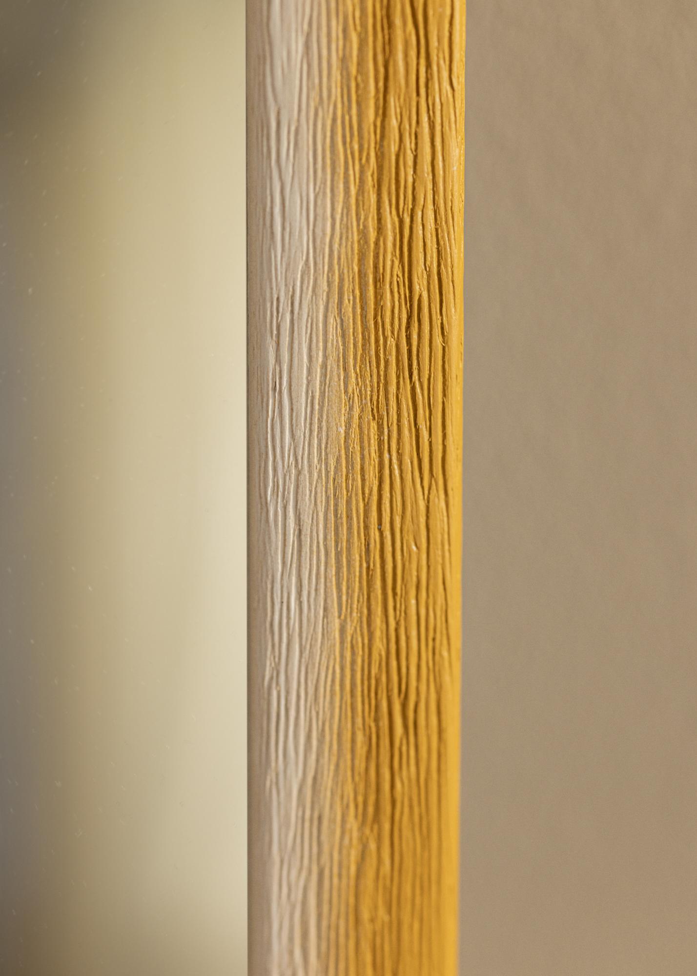To zrcalo izstopa z harmoničnim prehajanjem barv od svetlo, naravne bele barve do tople okerne rumene nijanse. Ta subtilen prehod ustvarja mehak, pobarvan izraz, ki prostoru daje živahno globino. Površina okvirja je zaznamovana z izrazito lesno strukturo z globokimi grčami, kar daje otipljiv in naraven občutek. To zrcalo ni samo funkcionalno, ampak tudi dekorativni element vašega doma.