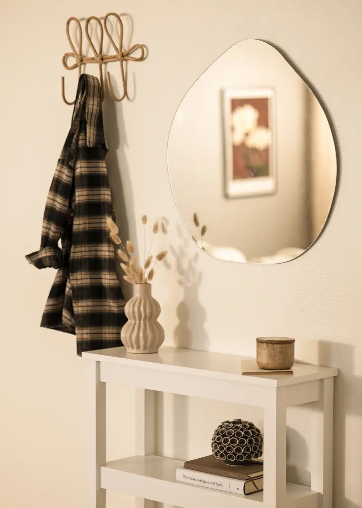 To ogledalo je zasnovano tako, da je vsestransko, z možnostjo obešanja tako pokončno kot ležeče. To vam omogoča svobodo izbire, kako se najbolje prilega vašemu prostoru, ne glede na to, ali je v predsobi, spalnici ali dnevni sobi. Asimetrična oblika prinaša moderni pridih, ki dopolnjuje različne stile notranje opreme in ustvarja zanimiv vizualni učinek.