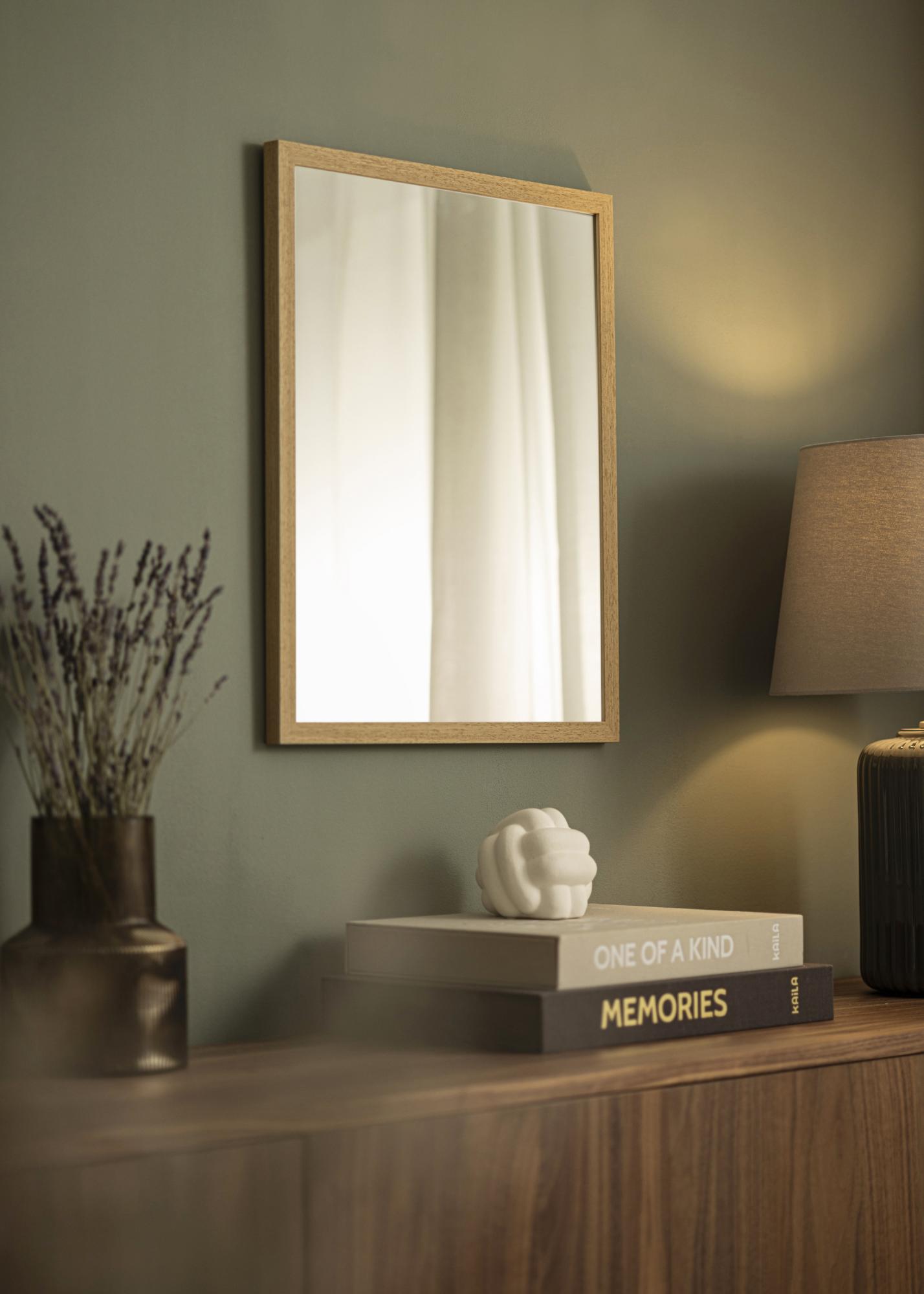 Okvir ogledala je izdelan iz ajosa, kar mu daje tako trpežnost kot stil. Z širino 20 mm in globino 20 mm ima okvir diskretno, vendar še vedno opazno prisotnost, ki na okusen način uokviri ogledalno steklo. Površina ima mat finiš z rahlo teksturiranim občutkom, kar prispeva k čarom ogledala in ga naredi odlično izbiro za tako moderne kot tradicionalne notranje ureditve.