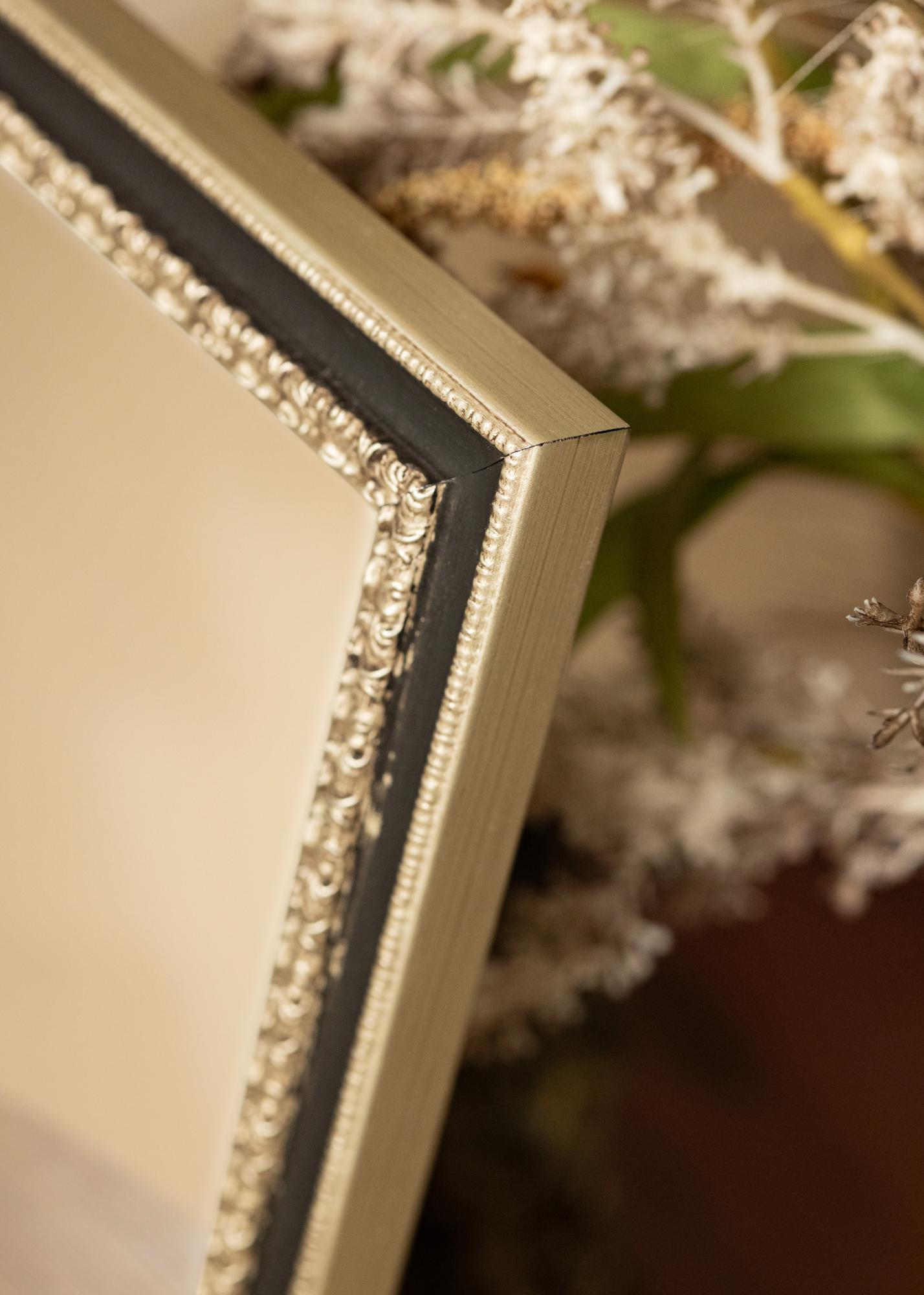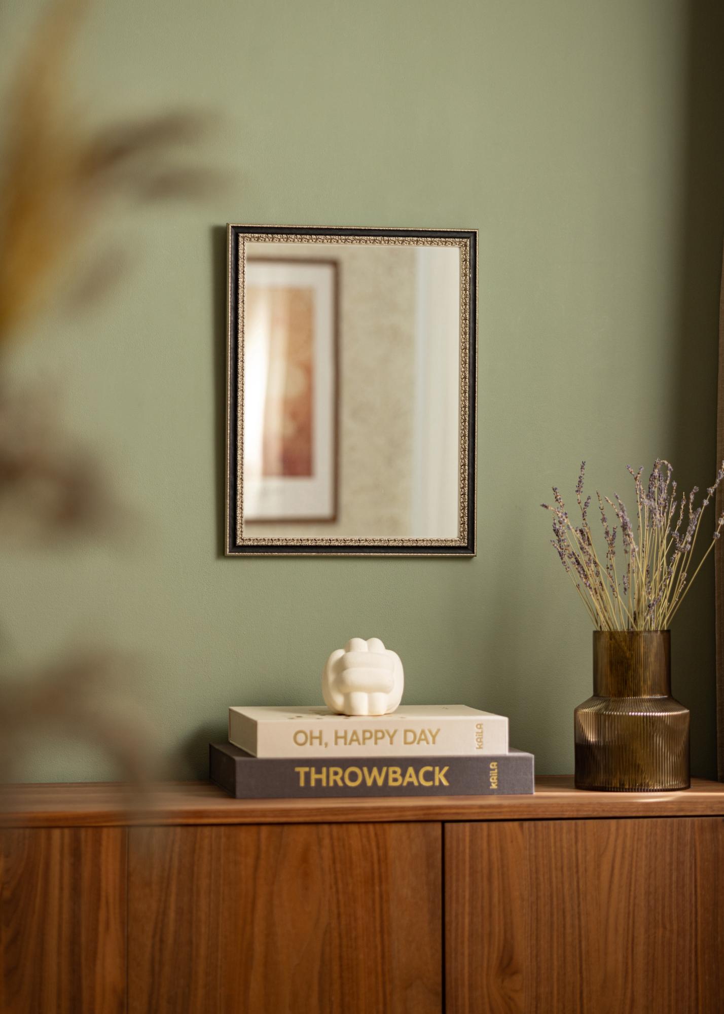 Okvir je izdelan iz lesa in ima antikno zlato površino z dekorativnimi okraski, ki dajejo zrcalu klasičen in brezčasen občutek. Okrašeni detajli so dodatno poudarjeni s črnim robom, kar ustvarja harmonično ravnovesje med antiko in moderno.