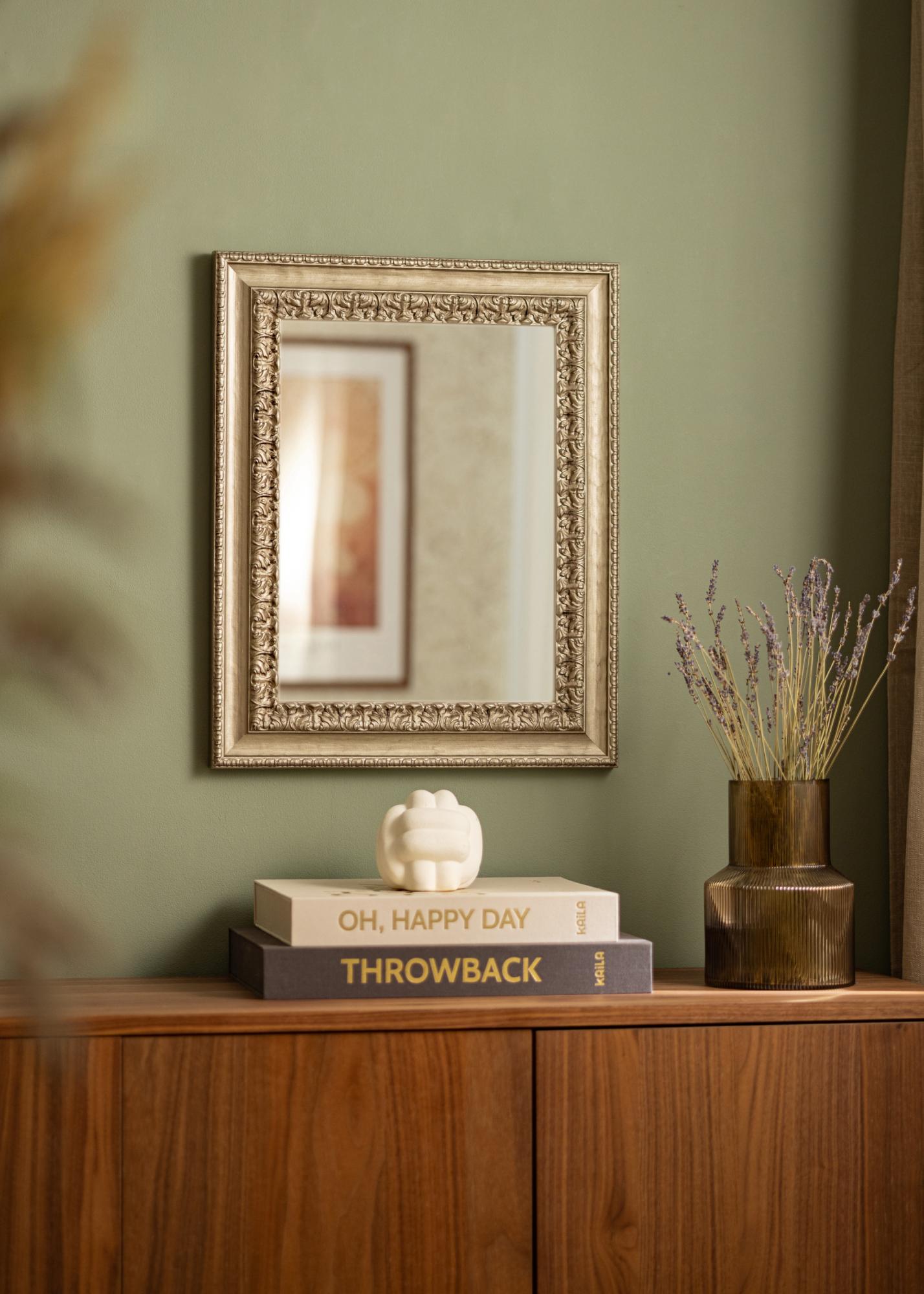 To ogledalo ima antični zlati ton z rahlo patinirano površino, ki poudarja klasičen občutek. Detajlni ornamenti v reliefu vzdolž notranjega roba dajejo ogledalu eleganten izraz, ki privlači poglede. Krtačen zaključek poudarja globino dekoracije in ustvarja subtilen starinski učinek, zaradi česar se ogledalo zdi hkrati brezčasno in moderno.
