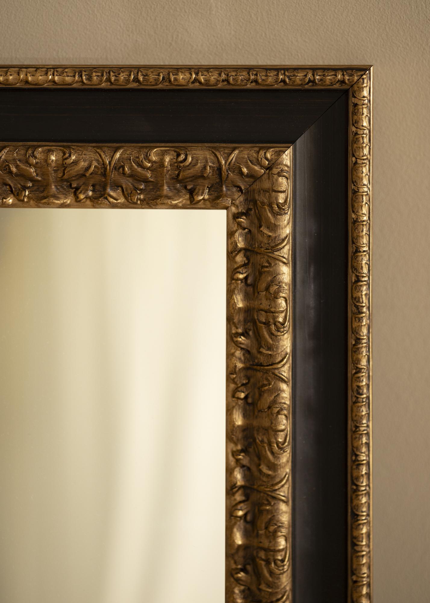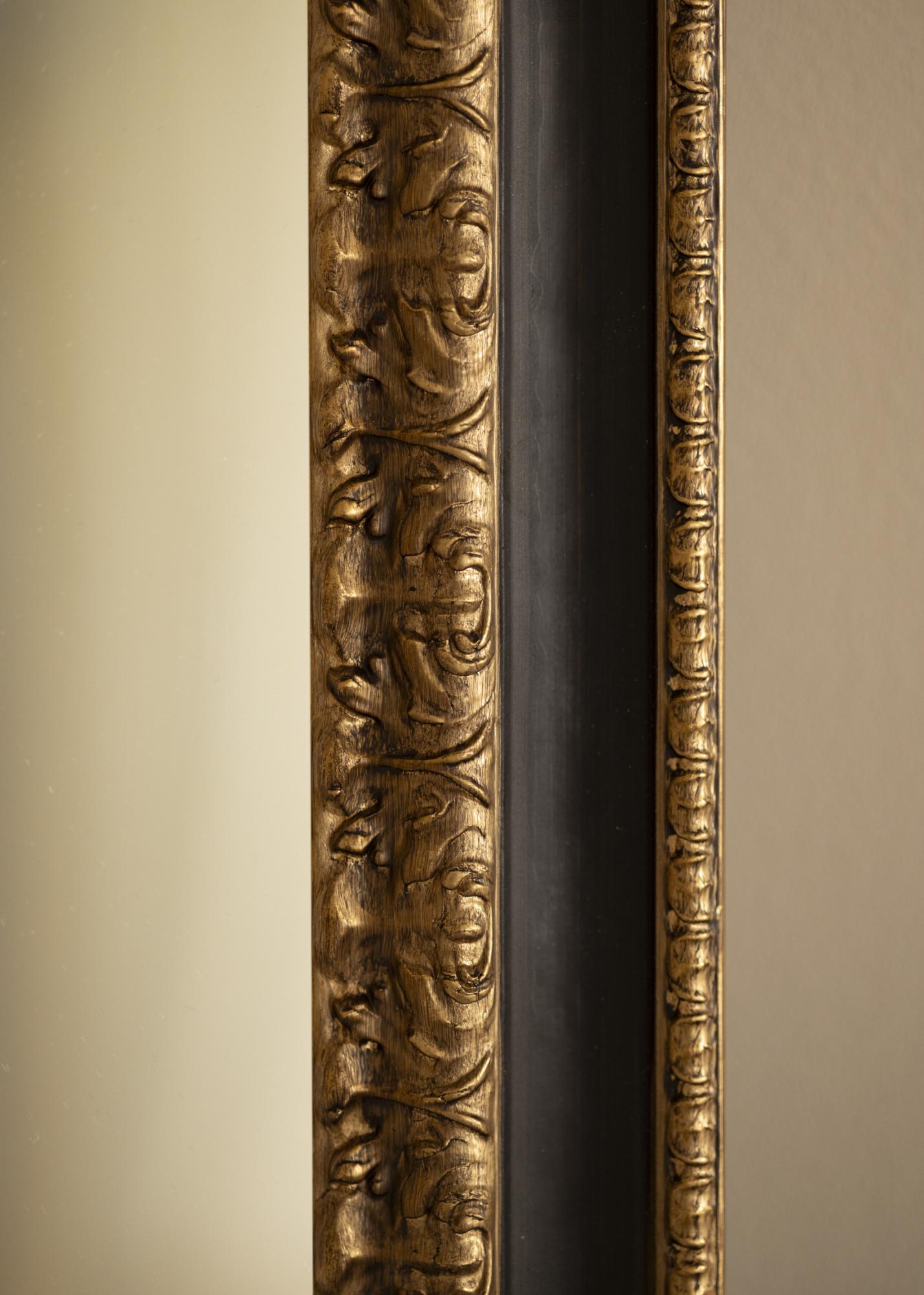 "Drottningholm Guld" je čudovito retro ogledalo iz Italije iz prstno spojene jelke, ki je ročno pobarvano. Ogledalo ima bogato okrašeni zlati profil s širokim črnim robom, kar daje okvirju eleganten občutek.