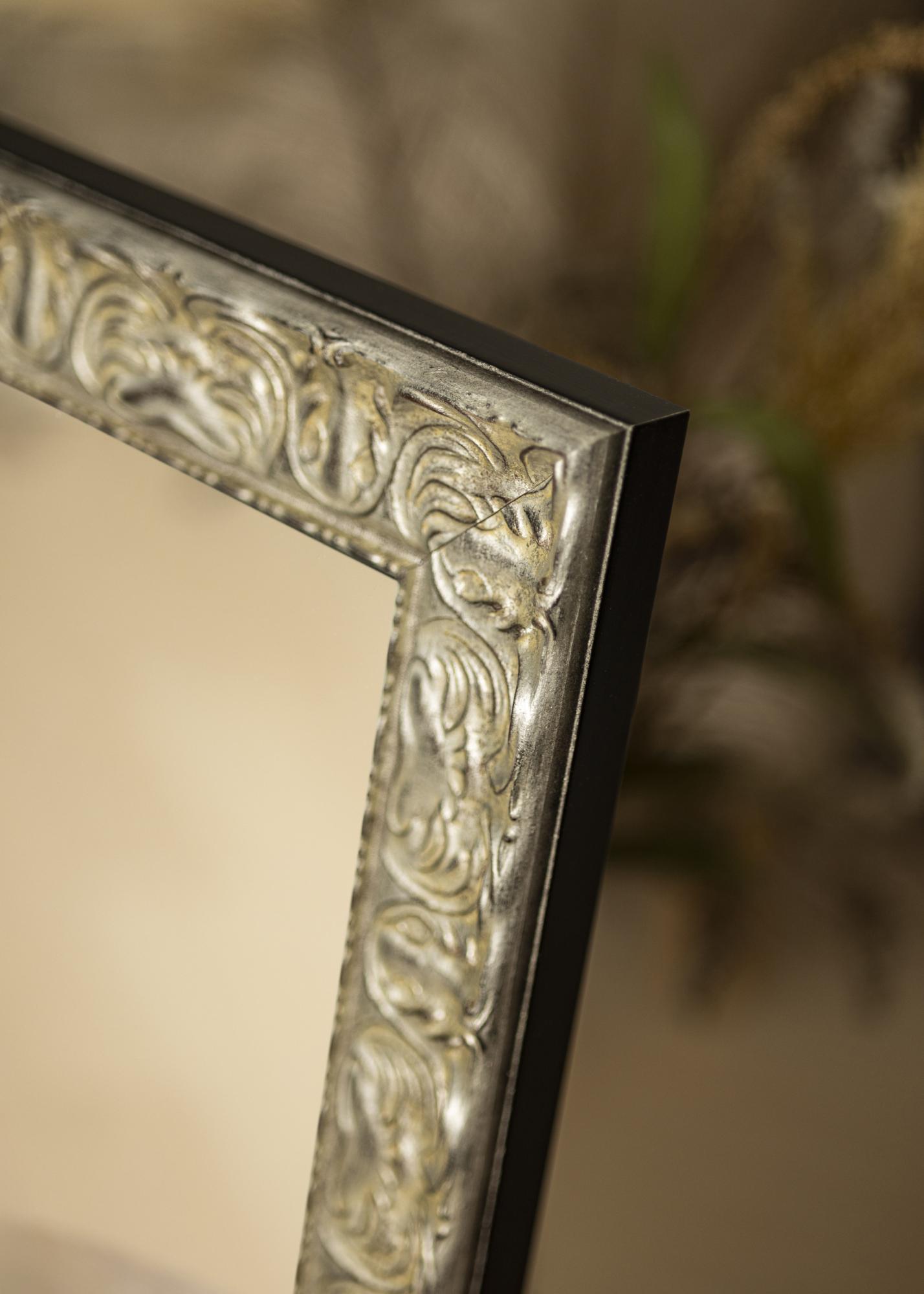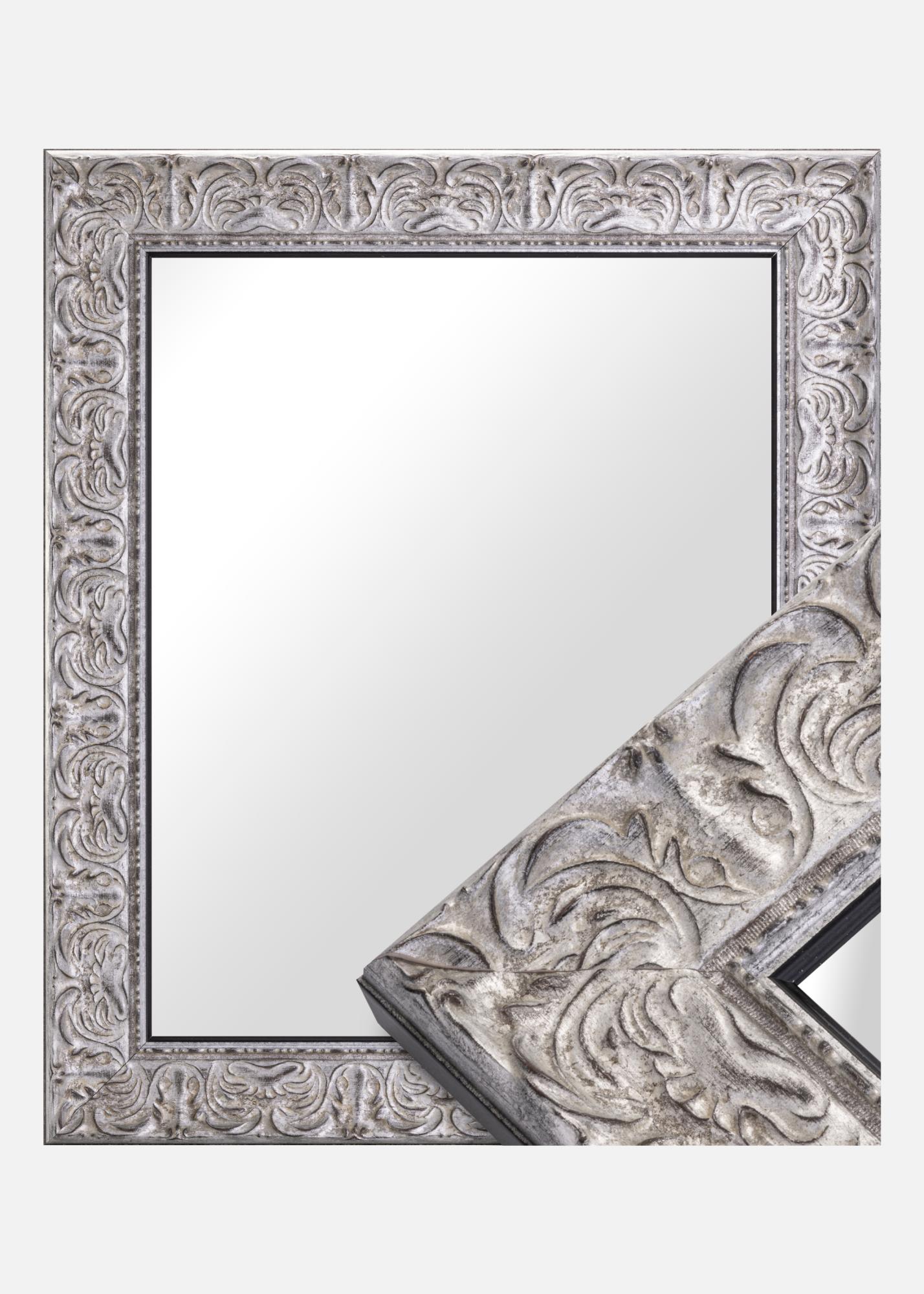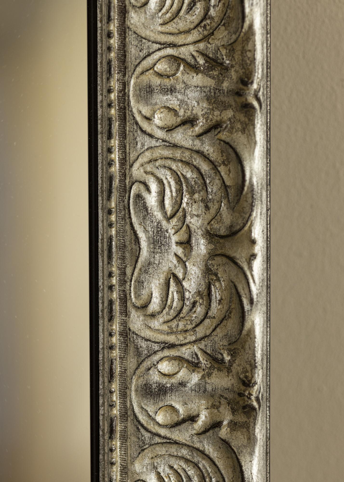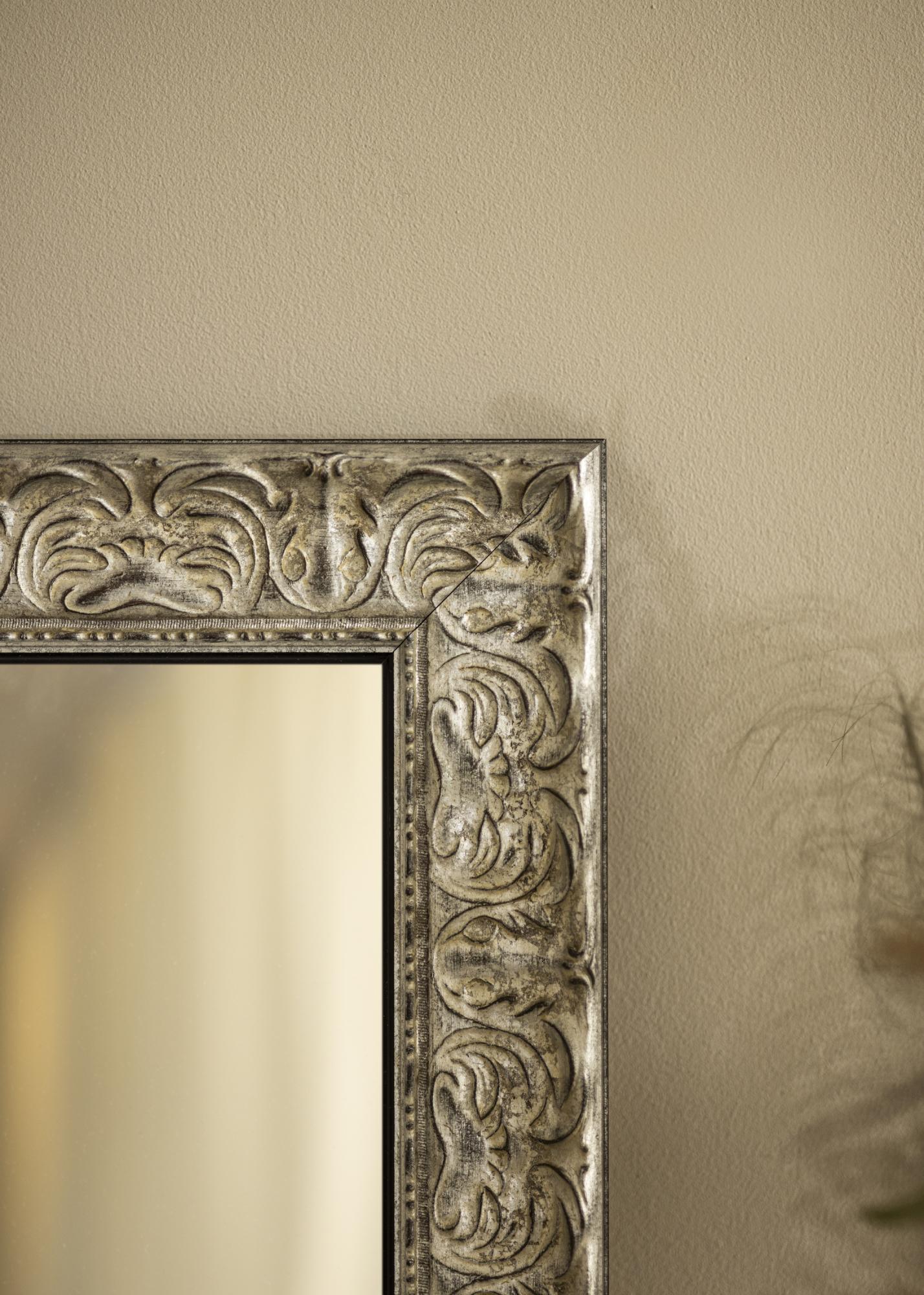 Ogledalo Durham Silver je ogledalo po meri, ki ga izdelamo, da ustreza vašim potrebam. S svojim srebrnim okvirjem in starinskim finišem postane eleganten dodatek v katerem koli prostoru. Ornamenti na okvirju dajejo ogledalu edinstven značaj in prispevajo k rustikalnemu, vendar elegantnemu občutku.