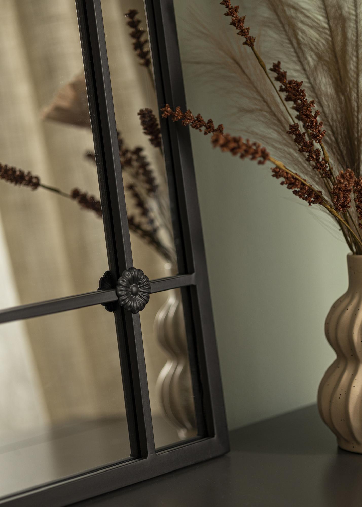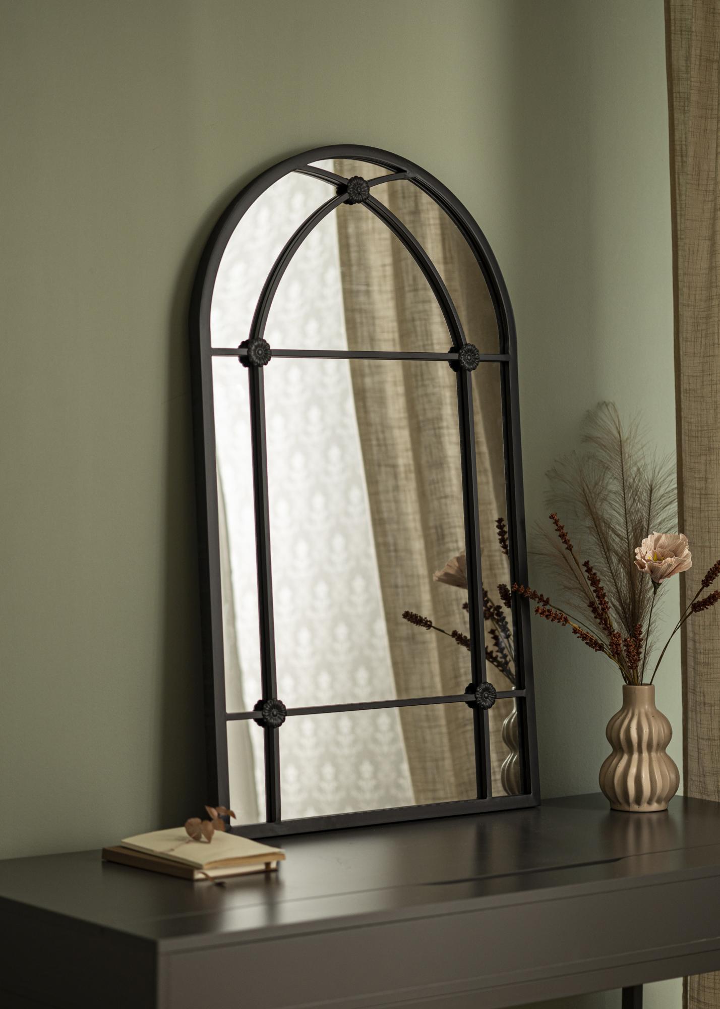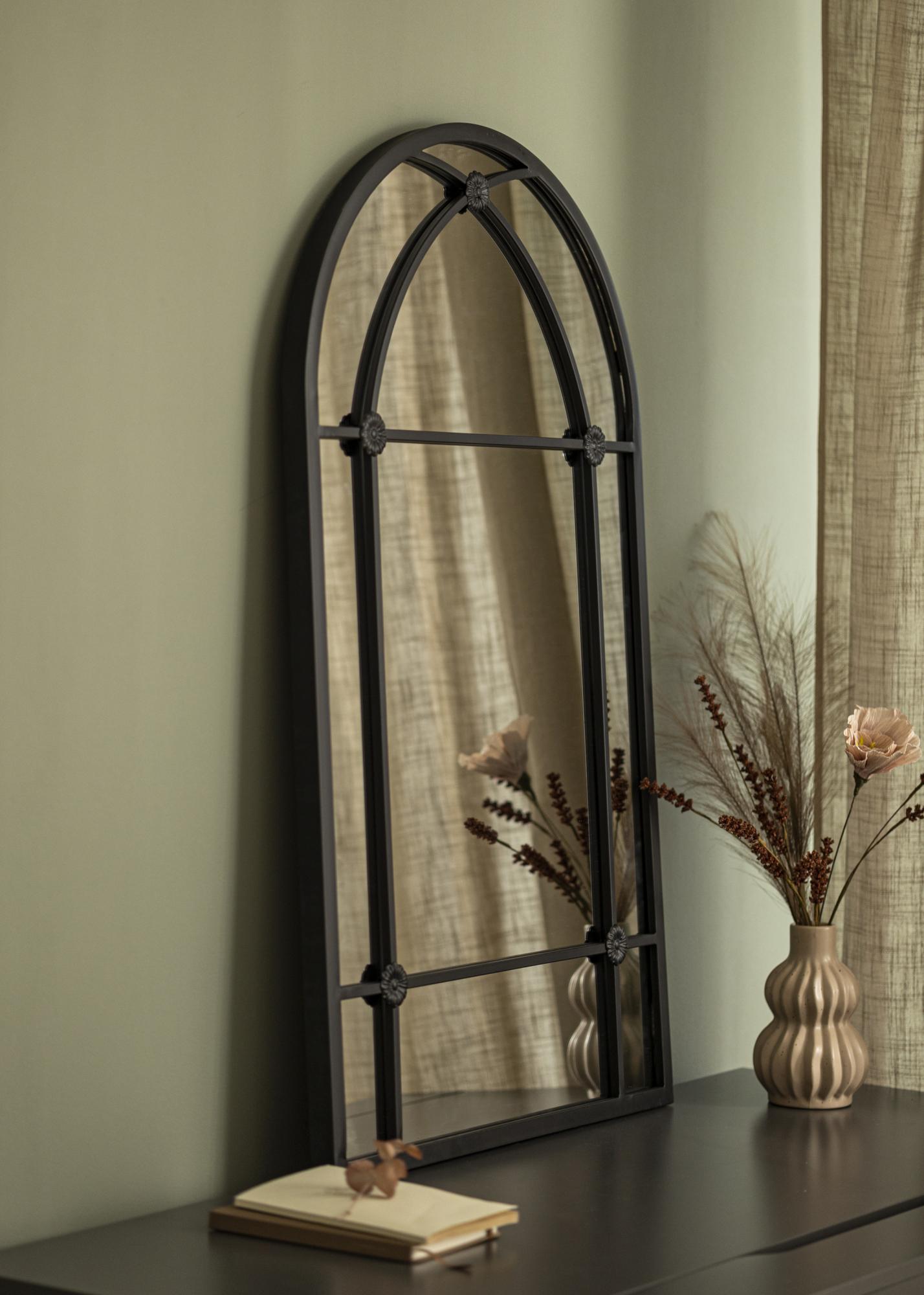 S svojo obokano silhueto in podrobno kovinsko konstrukcijo, ogledalo spominja na klasična okna, ki dajejo občutek globine in prostora v sobi. Ni samo praktičen predmet za vsakodnevno uporabo, ampak tudi umetniška dekoracija, ki pritegne pogled in prispeva k atmosferi prostora.